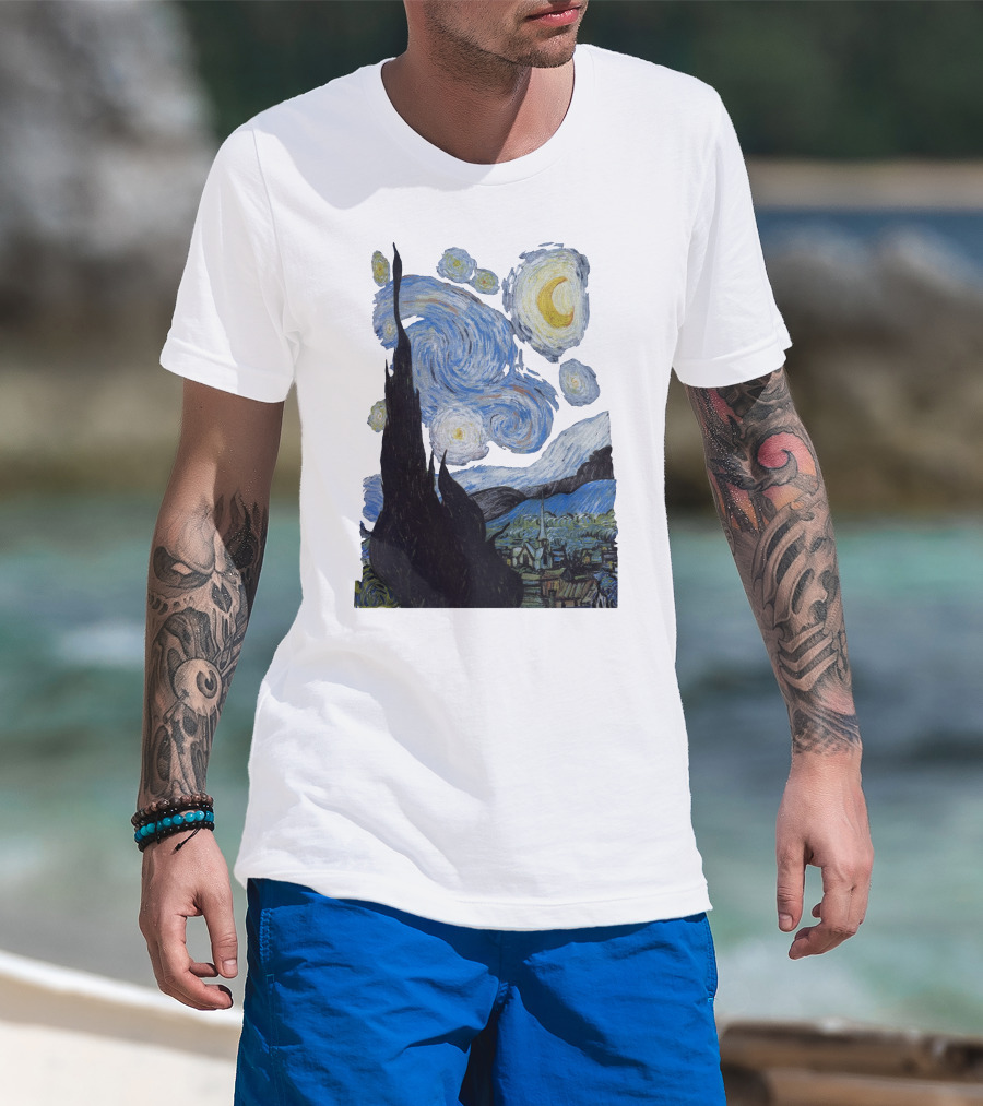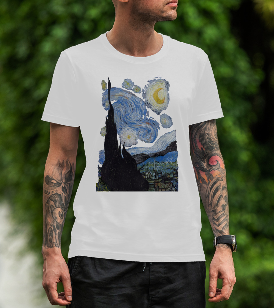 The Starry Night Vincent Van Gogh Painting Swirls and Sky T-shirt is designed for everyday wear and a consistent fit. Fabric is pre-shrunk ring-spun cotton with durable stitching. See the size chart below for exact measurements.