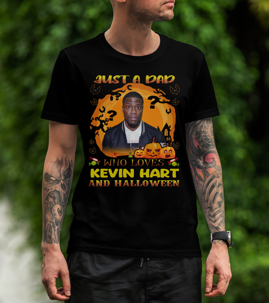 Just A Dad Who Loves Kevin Hart Surrounded By Spooky Halloween Pumpkins And Moon T-Shirt