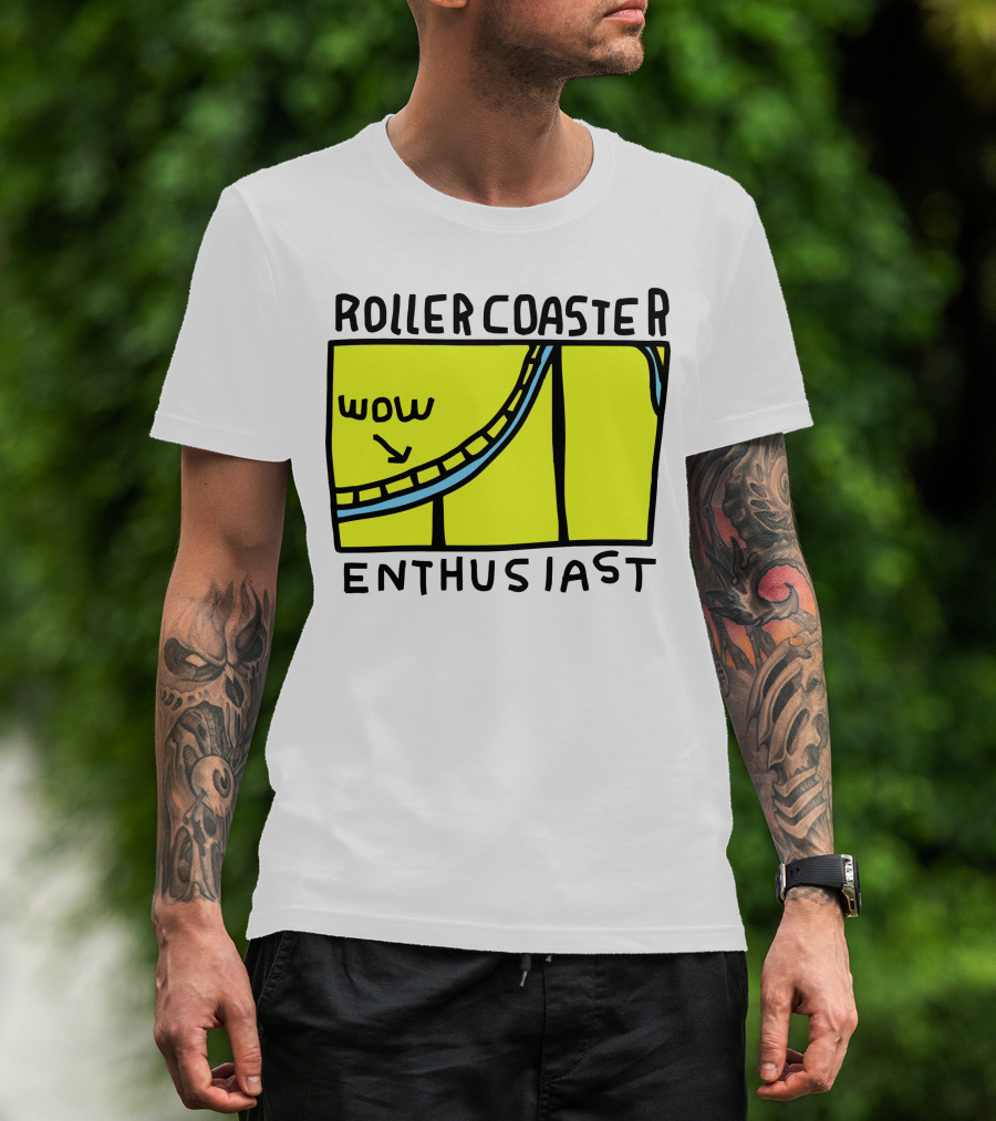 The Roller Coaster Enthusiast Wow T-shirt is designed for everyday wear and a consistent fit. Fabric is pre-shrunk ring-spun cotton with durable stitching. See the size chart below for exact measurements.