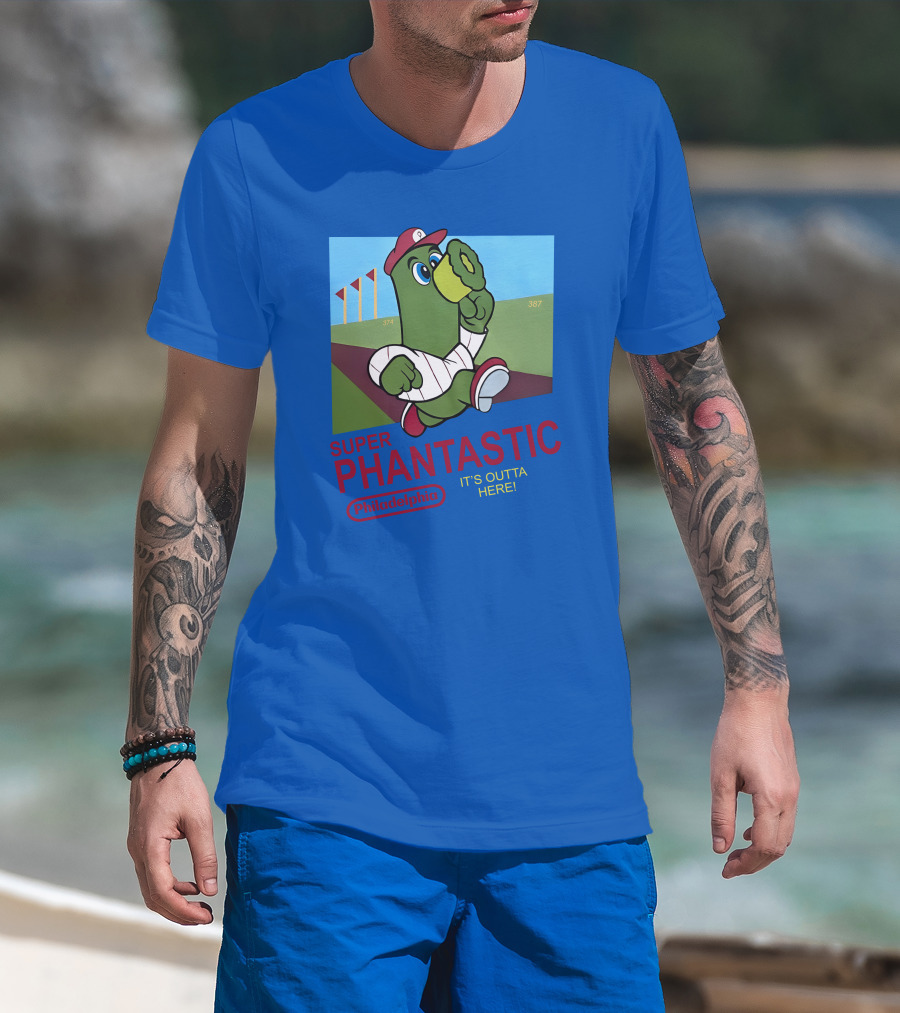 The Southfellini Merch Super Phantastic Philadelphia It's Outta Here Baseball Character T-shirt is designed for everyday wear and a consistent fit. Fabric is pre-shrunk ring-spun cotton with durable stitching. See the size chart below for exact measurements.