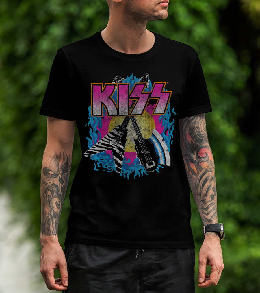 KISS Young Wasted Zebra Stripe Flying V And Bass With Flaming Background T-Shirt