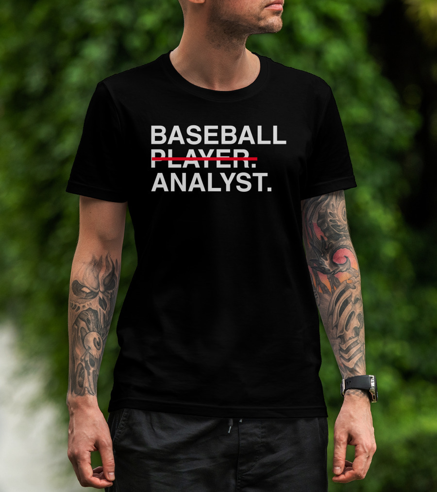 The Baseball Analyst Player Strikethrough T-shirt is designed for everyday wear and a consistent fit. Fabric is pre-shrunk ring-spun cotton with durable stitching. See the size chart below for exact measurements.