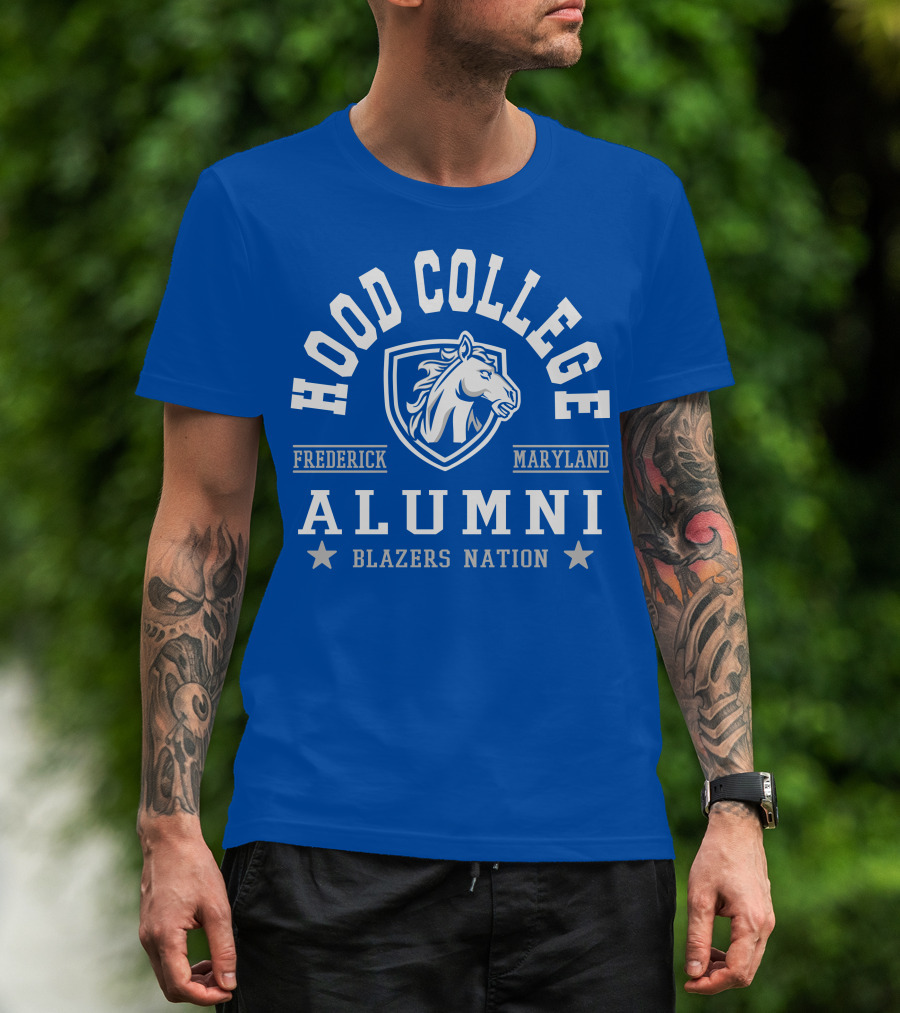 The Hood College Alumni Blazers Nation Frederick Maryland Horse T-shirt is designed for everyday wear and a consistent fit. Fabric is pre-shrunk ring-spun cotton with durable stitching. See the size chart below for exact measurements.