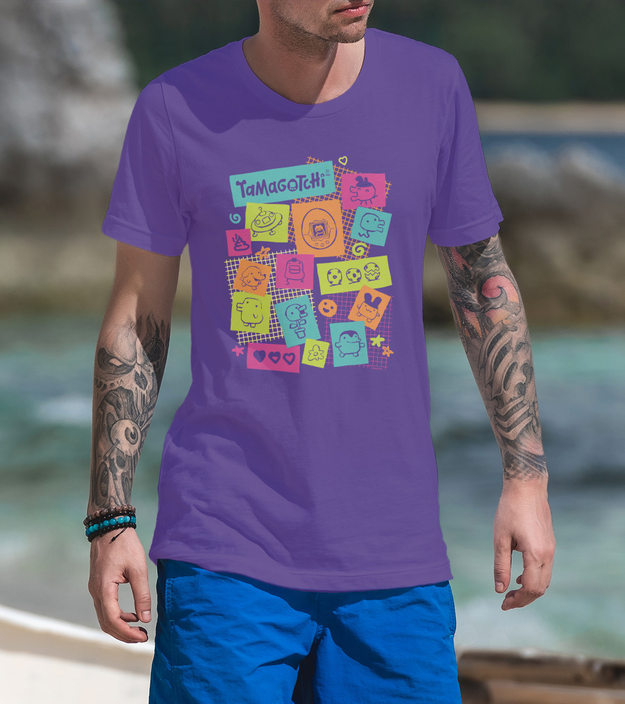 The Tamagotchi Neon Character Collage with Hearts and Stars T-shirt is designed for everyday wear and a consistent fit. Fabric is pre-shrunk ring-spun cotton with durable stitching. See the size chart below for exact measurements.