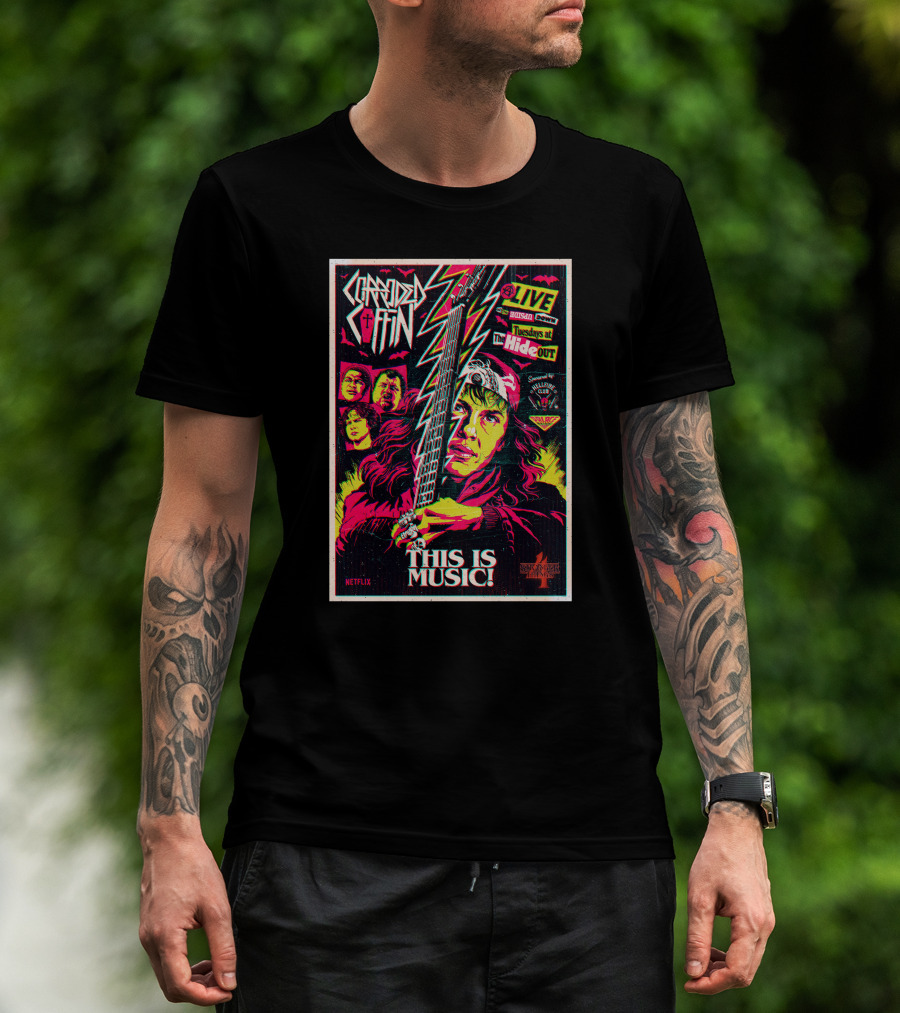 The Corroded Coffin Netflix Live Tuesdays at The Hideout Hawkins High This Is Music T-shirt is designed for everyday wear and a consistent fit. Fabric is pre-shrunk ring-spun cotton with durable stitching. See the size chart below for exact measurements.