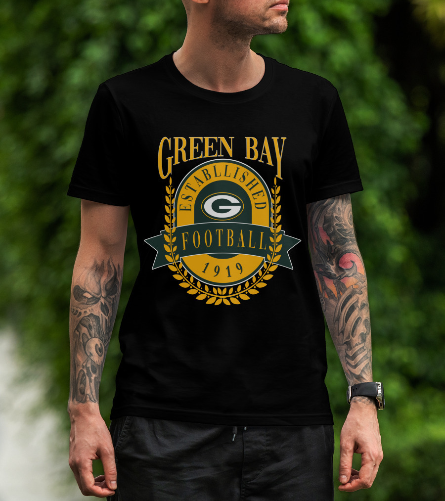 The Green Bay Packers Established 1919 Football T-shirt is designed for everyday wear and a consistent fit. Fabric is pre-shrunk ring-spun cotton with durable stitching. See the size chart below for exact measurements.
