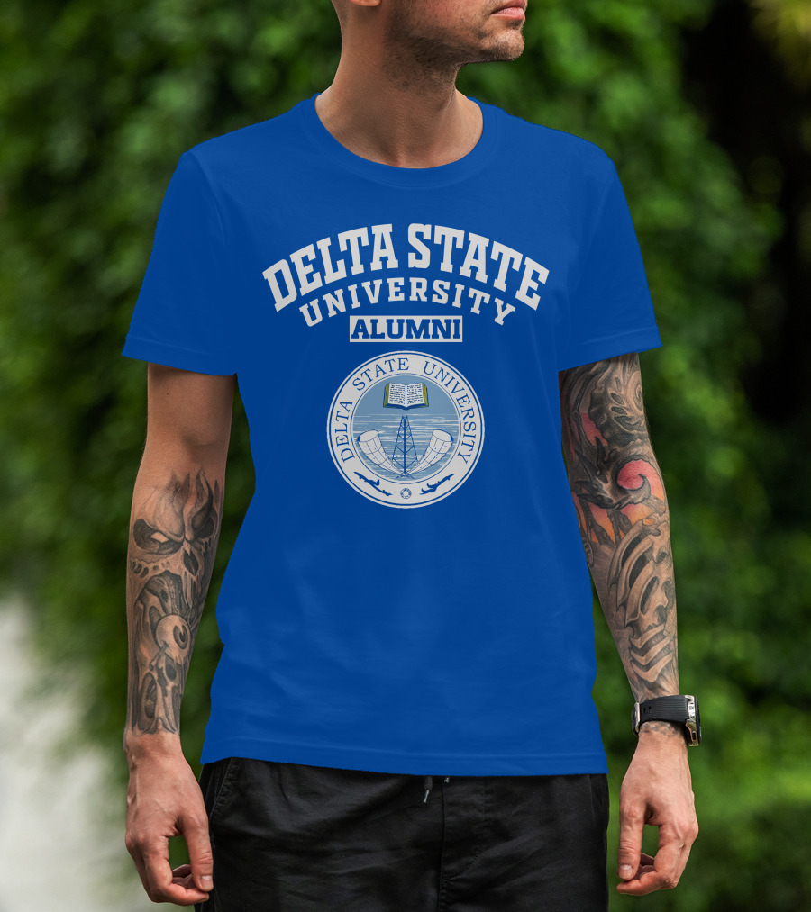 The Delta State University Alumni Emblem with Book and Columns T-shirt is designed for everyday wear and a consistent fit. Fabric is pre-shrunk ring-spun cotton with durable stitching. See the size chart below for exact measurements.