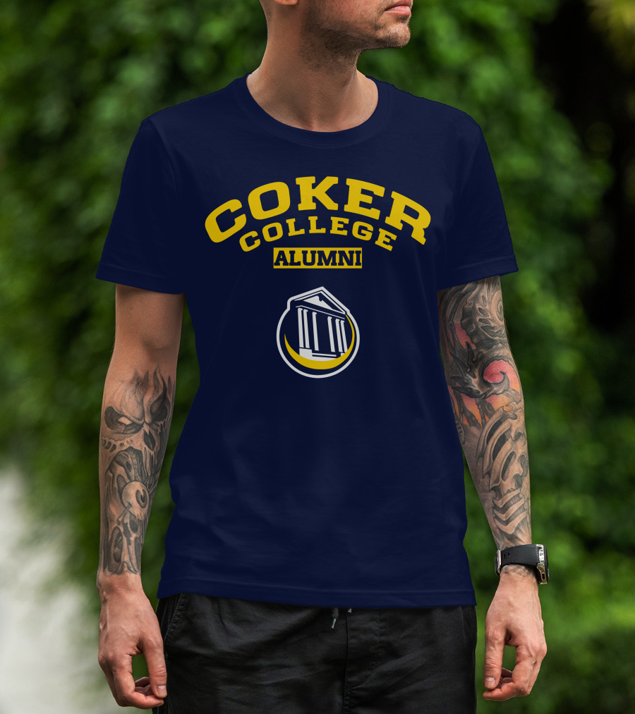 Coker College Alumni Yellow And Navy Blue Text With Greek Temple T-Shirt