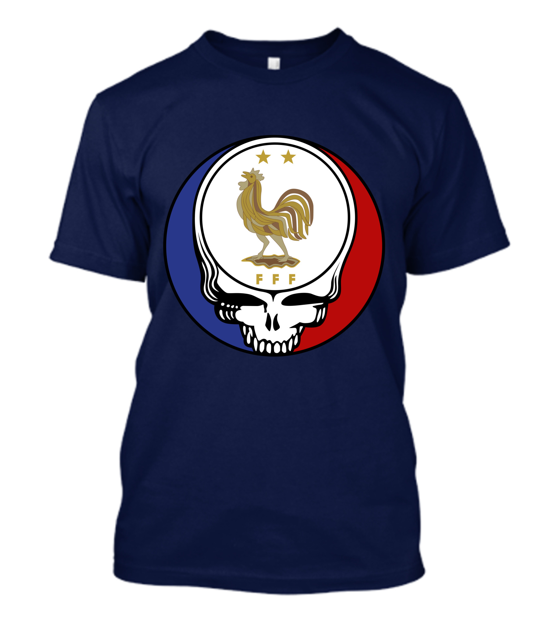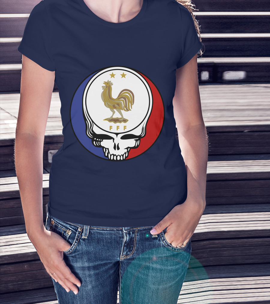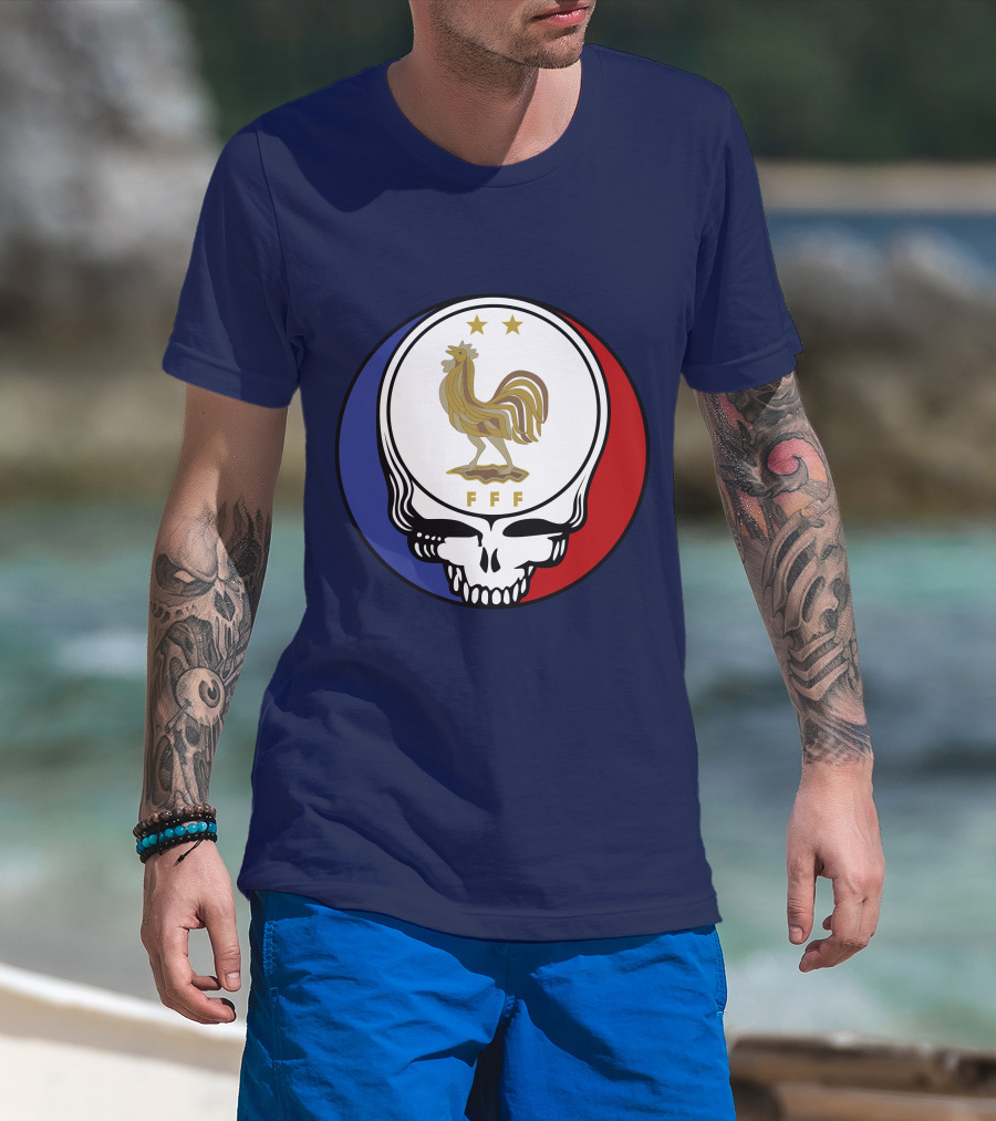 Equipe De France De Football Grateful Dead FFF Rooster Skull Red White Blue T-Shirt