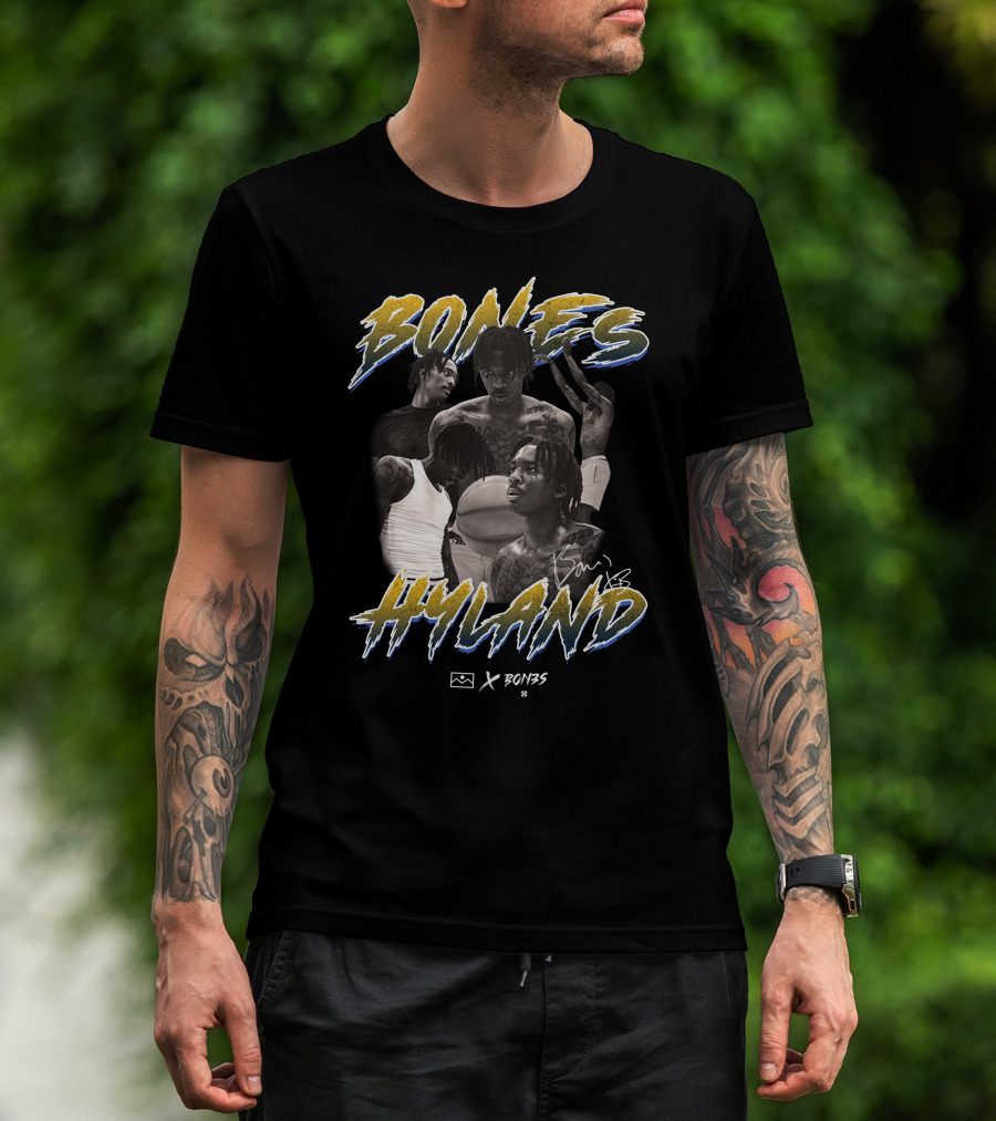 The Bones Hyland Vintage Photo Collage Basketball x Bones T-shirt is designed for everyday wear and a consistent fit. Fabric is pre-shrunk ring-spun cotton with durable stitching. See the size chart below for exact measurements.