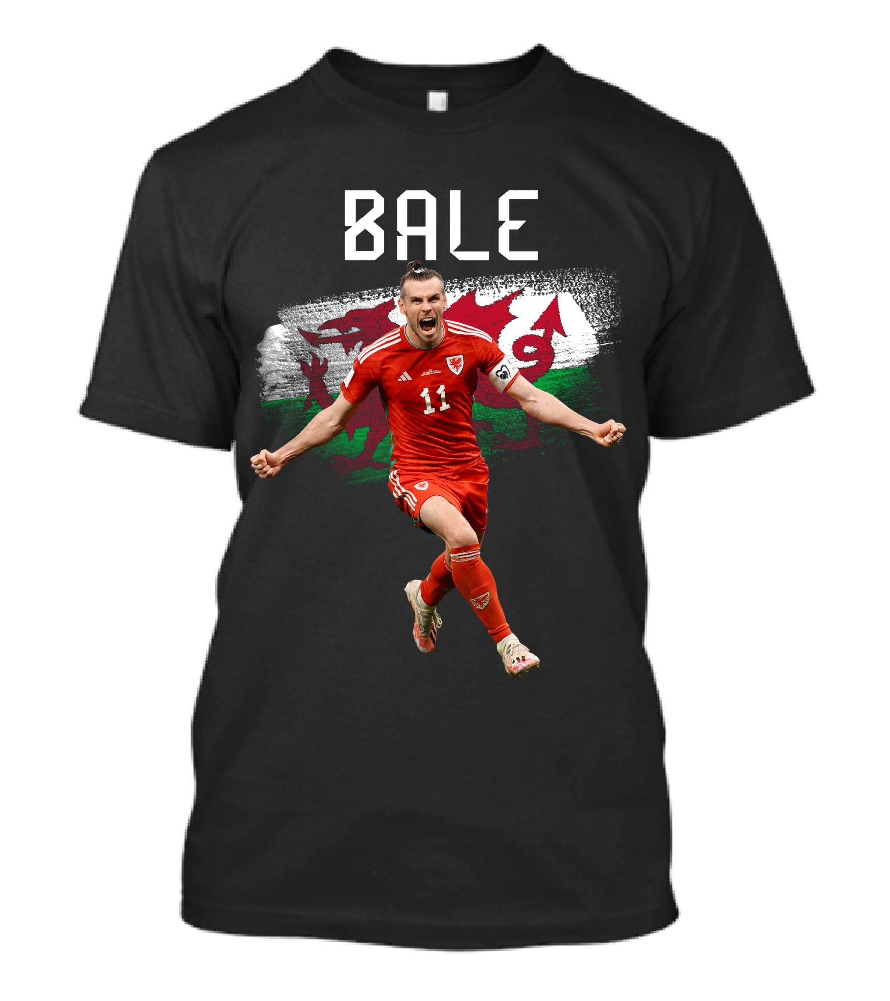 The Gareth Bale Wales Number 11 Red Jersey Dragon T-shirt is designed for everyday wear and a consistent fit. Fabric is pre-shrunk ring-spun cotton with durable stitching. See the size chart below for exact measurements.