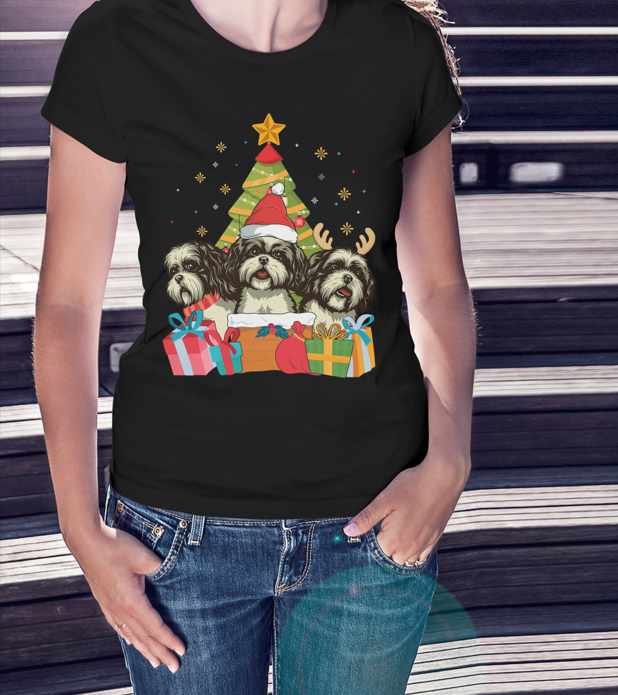 Christmas Shih Tzu Dogs With Santa Hat And Antlers By Xmas Tree T-Shirt