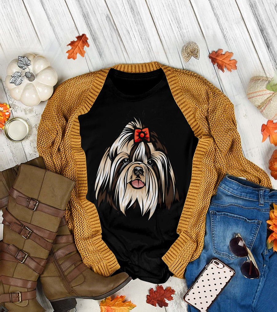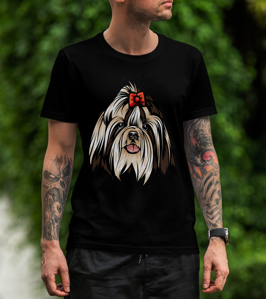 Cool Shih Tzu Face Red Bow Detailed T-Shirt