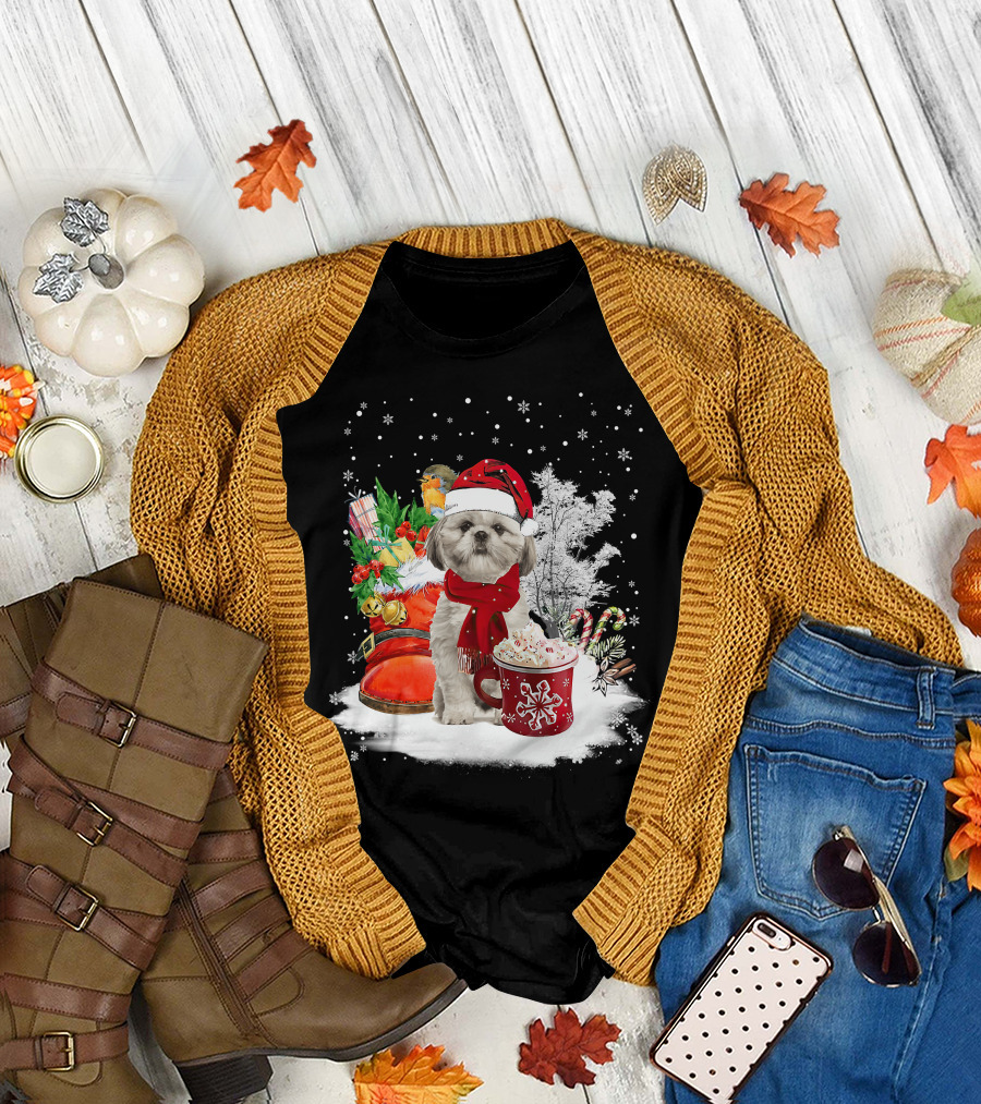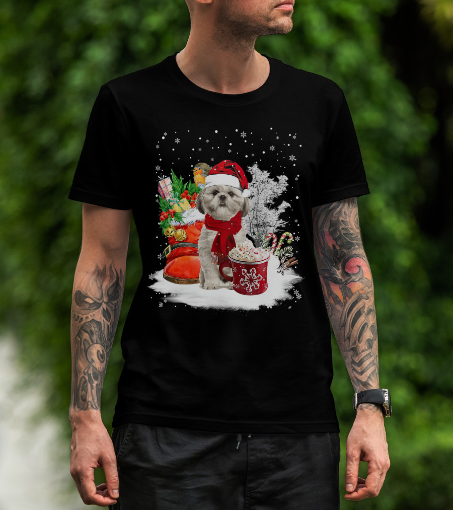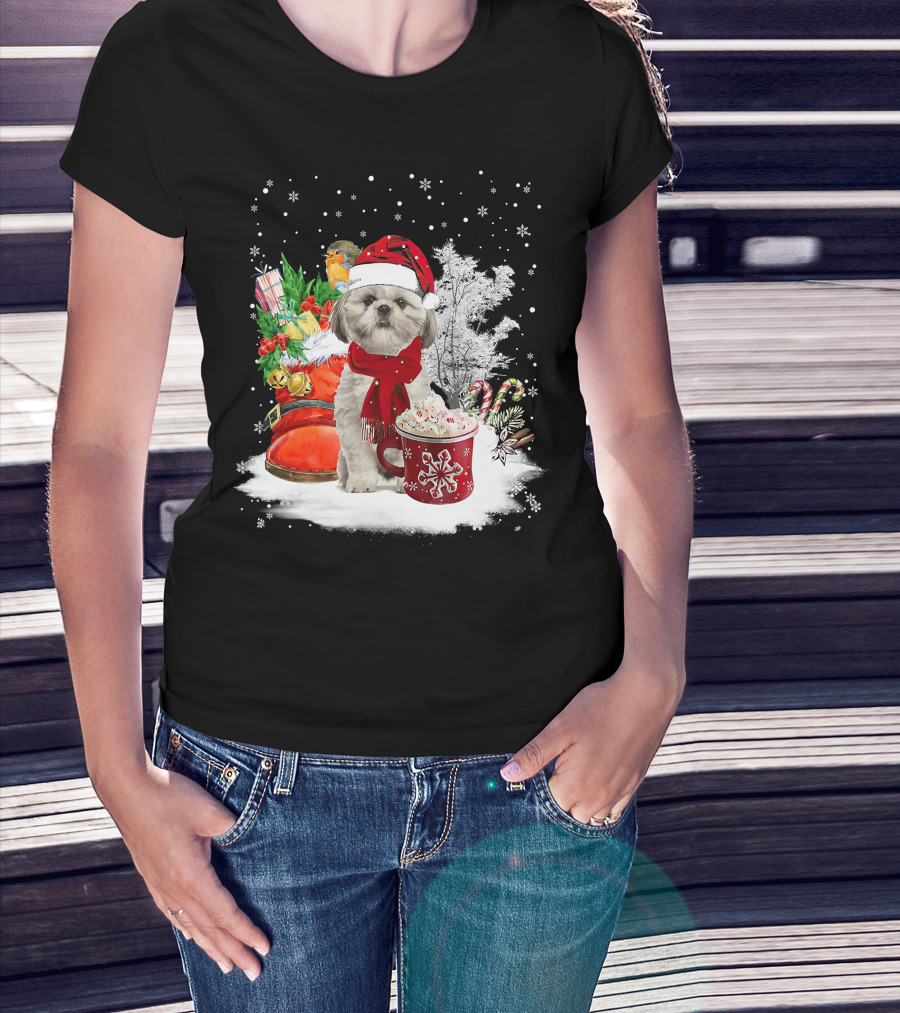 Shih Tzu Dog Santa Hat Hot Cocoa Christmas Scene T-Shirt