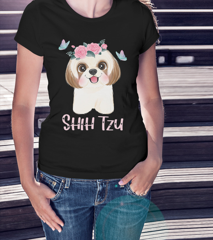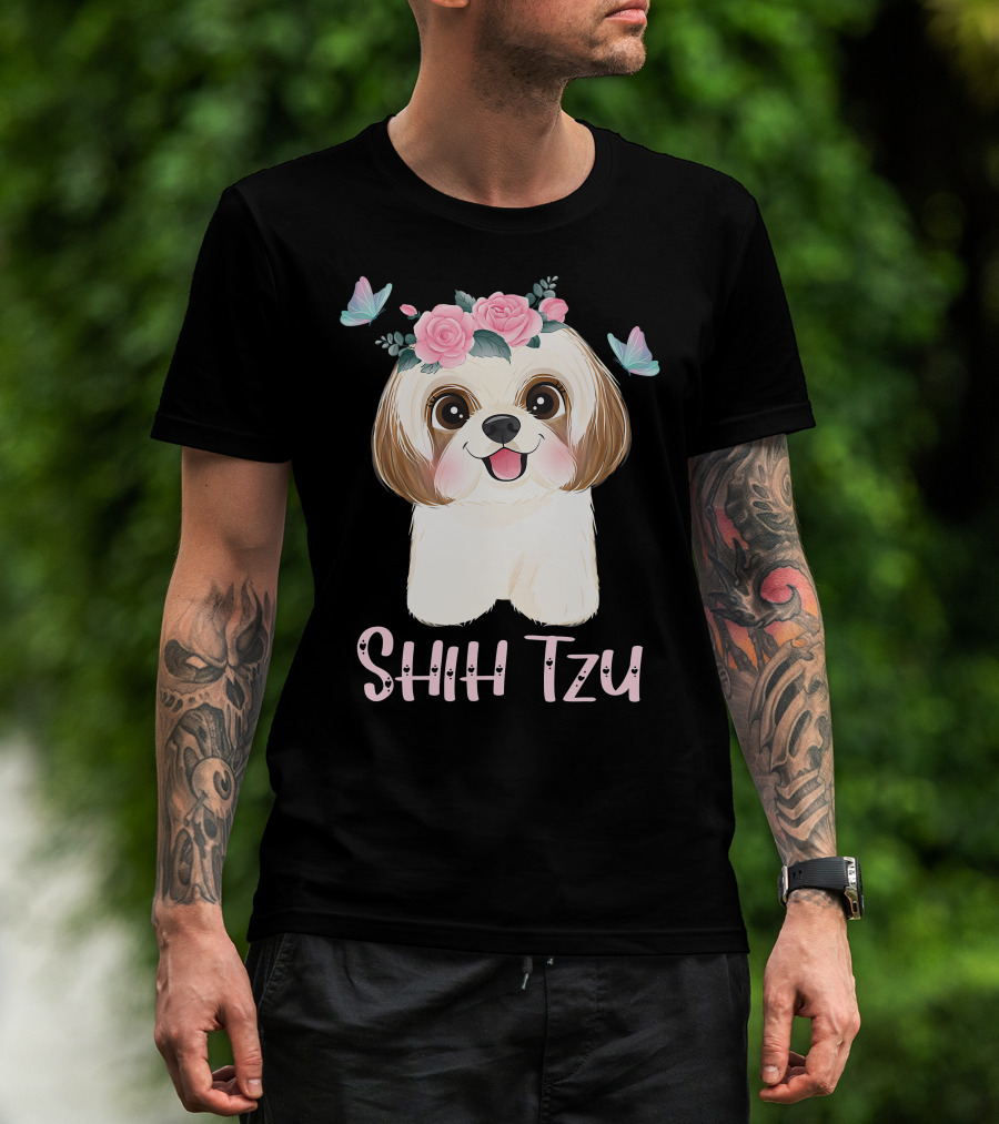 Cute Shih Tzu Mom Dad Mens Dog Lover Ladies Shih Tzu Roses Butterflies T-Shirt