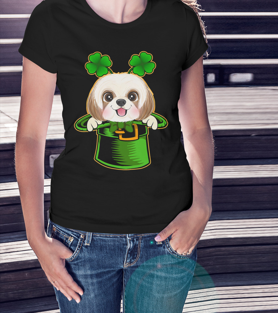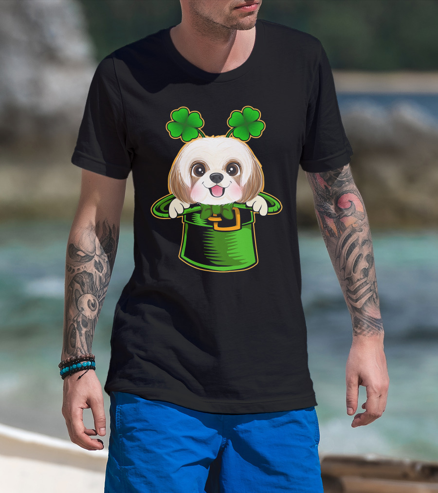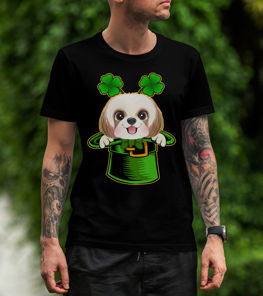 Leprechaun Hat Shih Tzu Dog With Green Clover Antennae T-Shirt