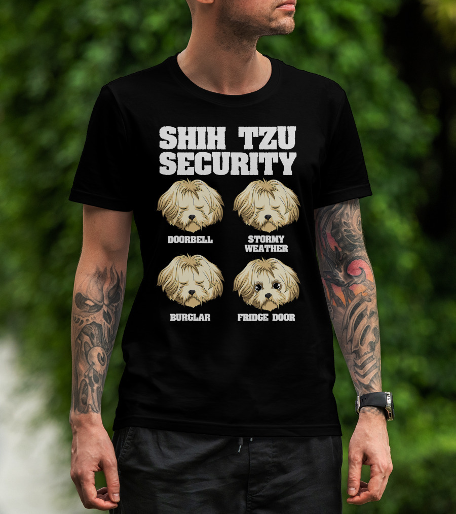 The Shih Tzu Security Fridge Door Pot Roast Vegetables Sausage Pate T-shirt is designed for everyday wear and a consistent fit. Fabric is pre-shrunk ring-spun cotton with durable stitching. See the size chart below for exact measurements.