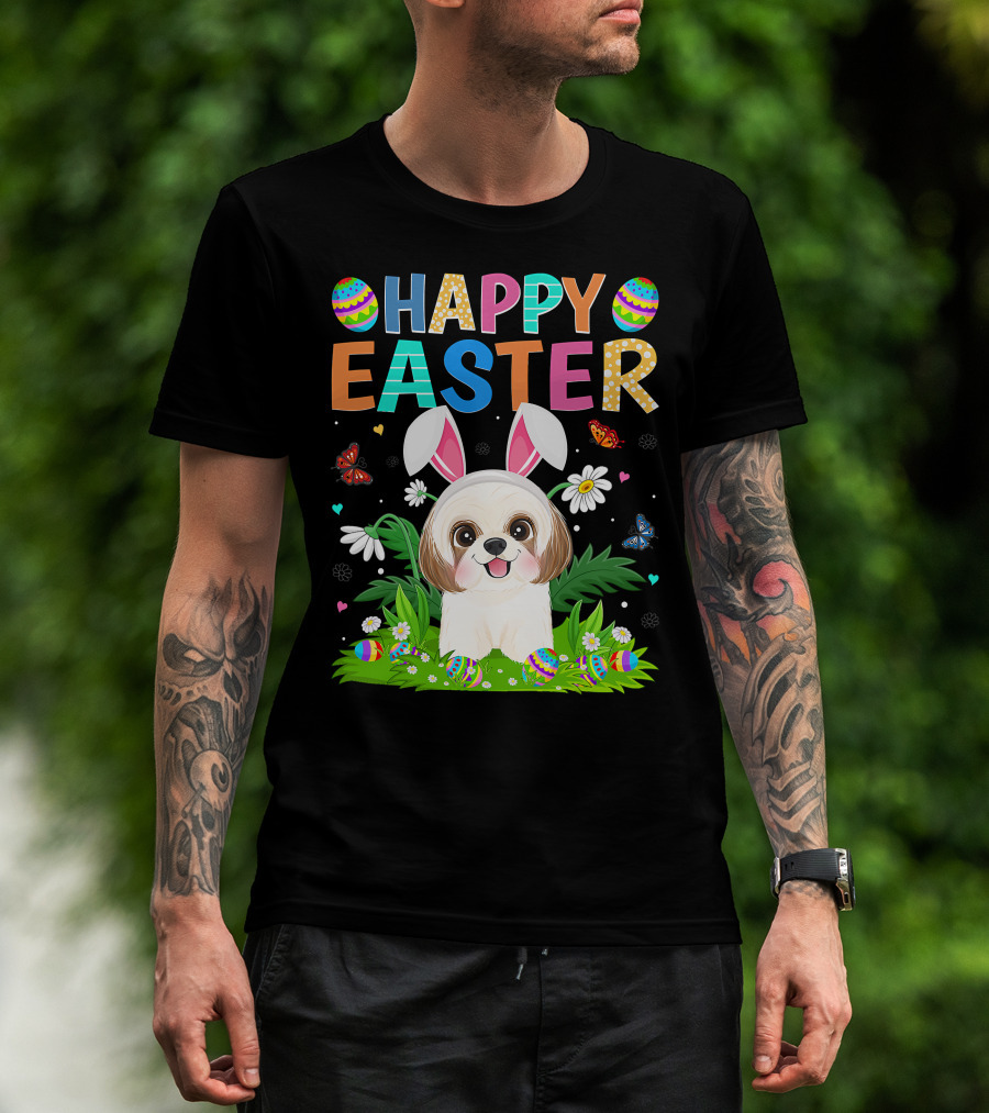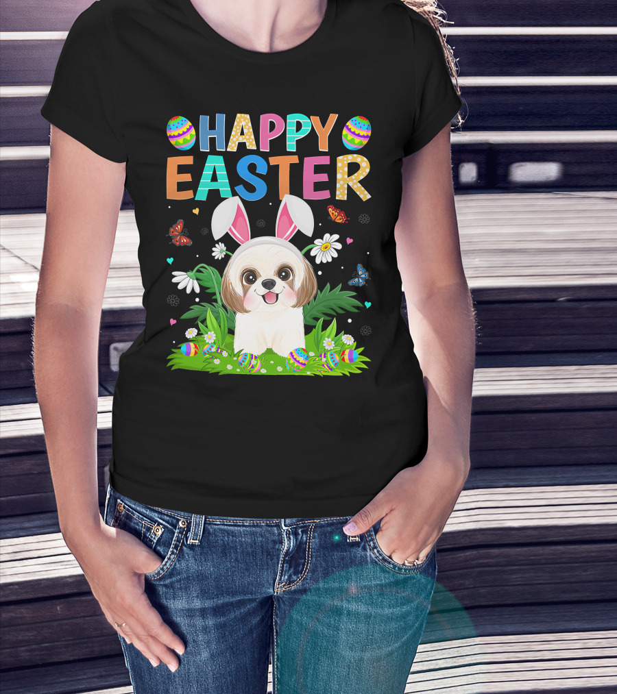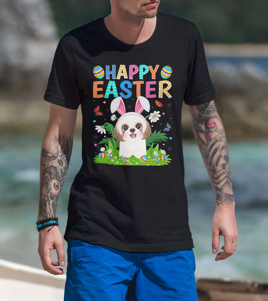 Happy Easter Bunny Shih Tzu Dog With Easter Eggs And Butterflies T-Shirt