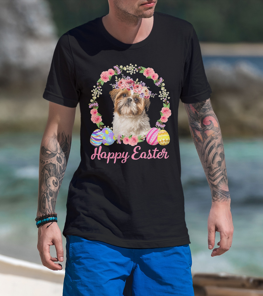 Happy Easter Shih Tzu Dog Flower Wreath With Decorative Eggs T-Shirt