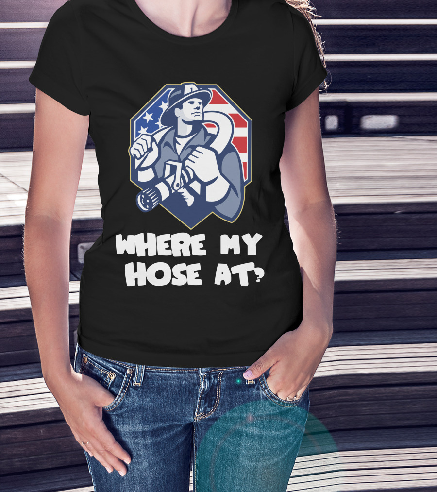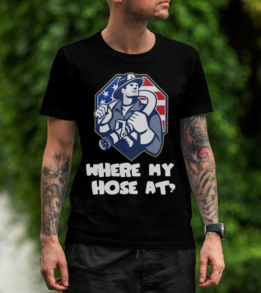 AMERICAN FIREFIGHTER WHERE MY HOSE AT? FLAG BACKGROUND T-Shirt