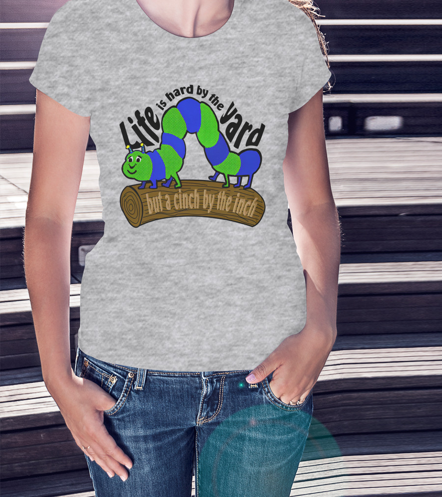 The Life Is Hard By The Yard But A Cinch By The Inch Caterpillar on Log T-shirt is designed for everyday wear and a consistent fit. Fabric is pre-shrunk ring-spun cotton with durable stitching. See the size chart below for exact measurements.