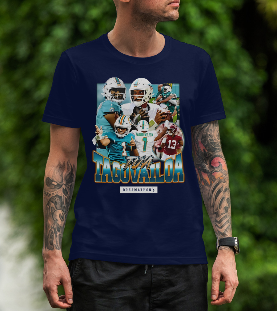 The Dreamathon Tua Tagovailoa Collage Football Action T-shirt is designed for everyday wear and a consistent fit. Fabric is pre-shrunk ring-spun cotton with durable stitching. See the size chart below for exact measurements.
