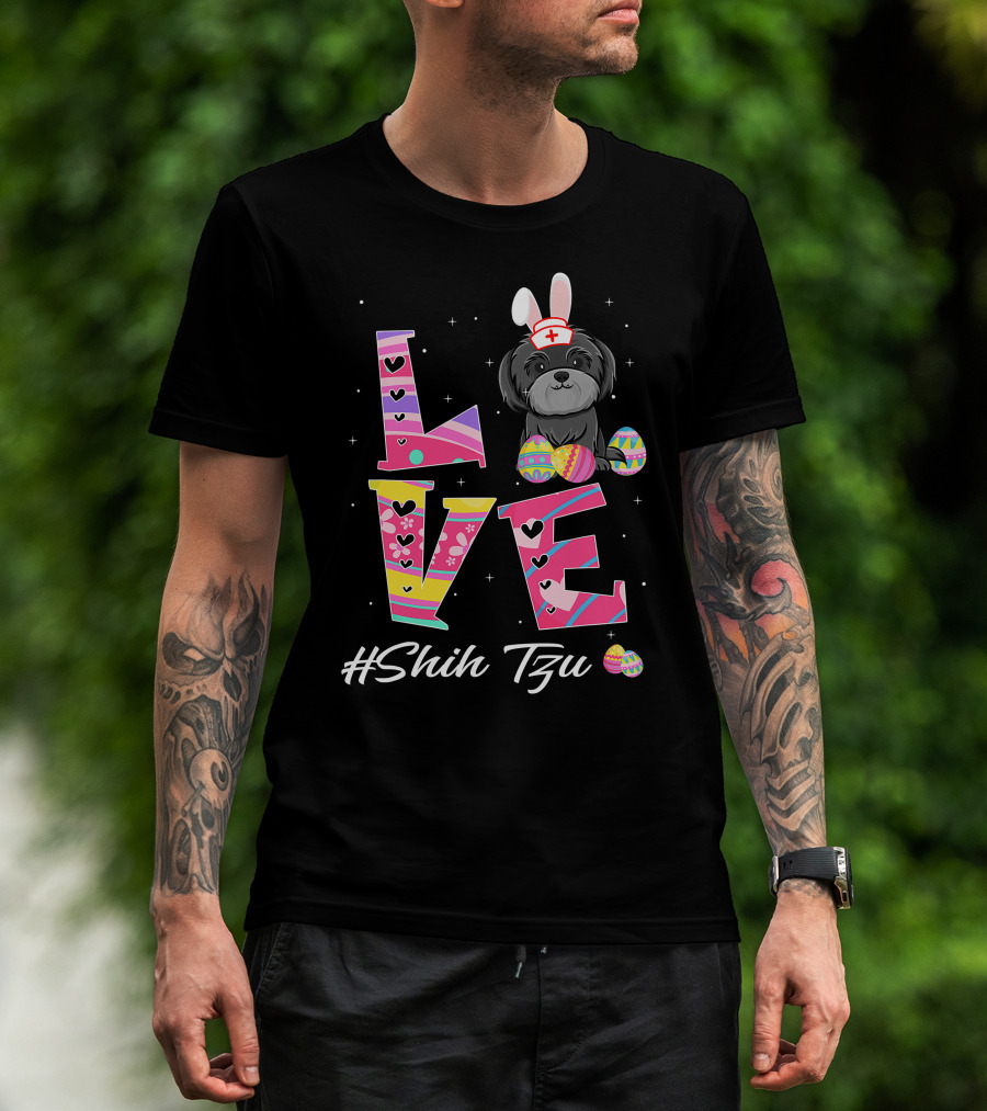 Love Easter Shih Tzu Bunny Ears Nurse Hat Egg Pattern Funny Dog Lovers T-Shirt