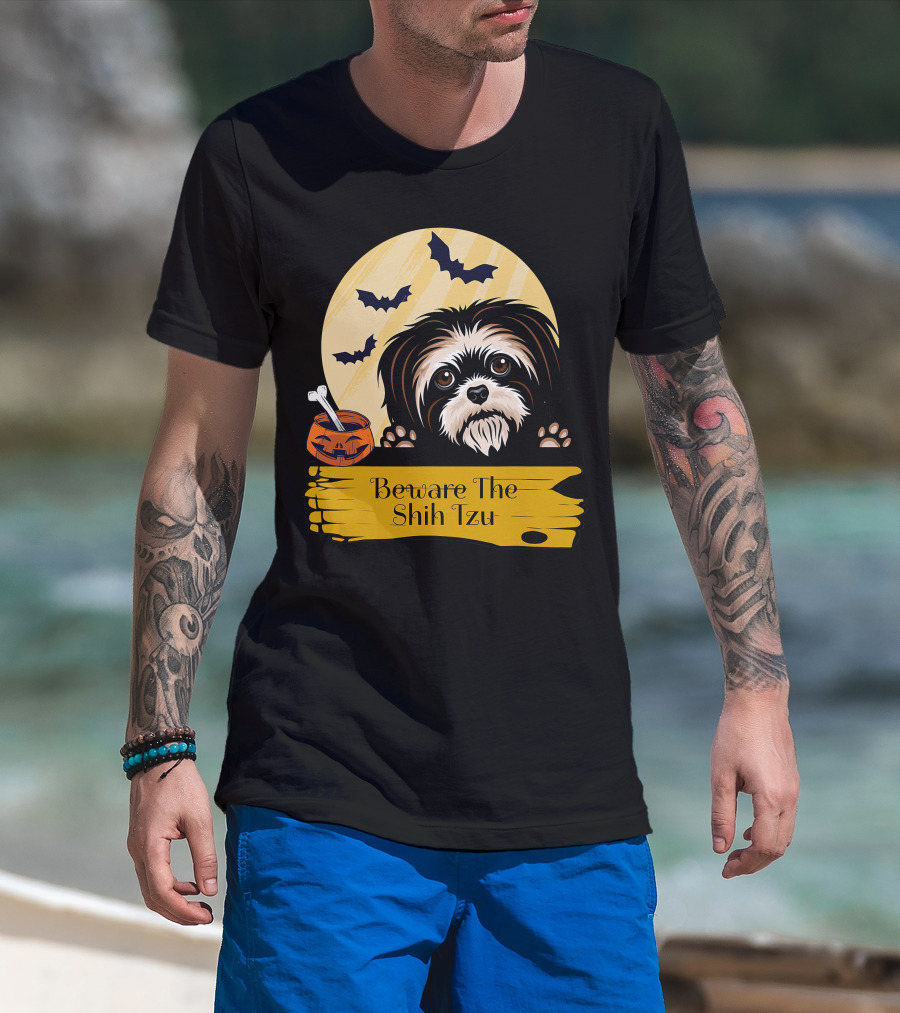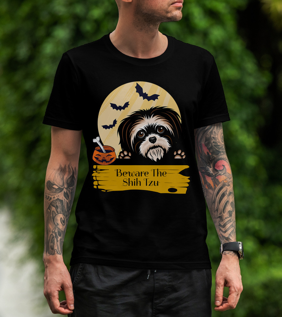 Beware The Shih Tzu Halloween Bats Moon Pumpkin T-Shirt