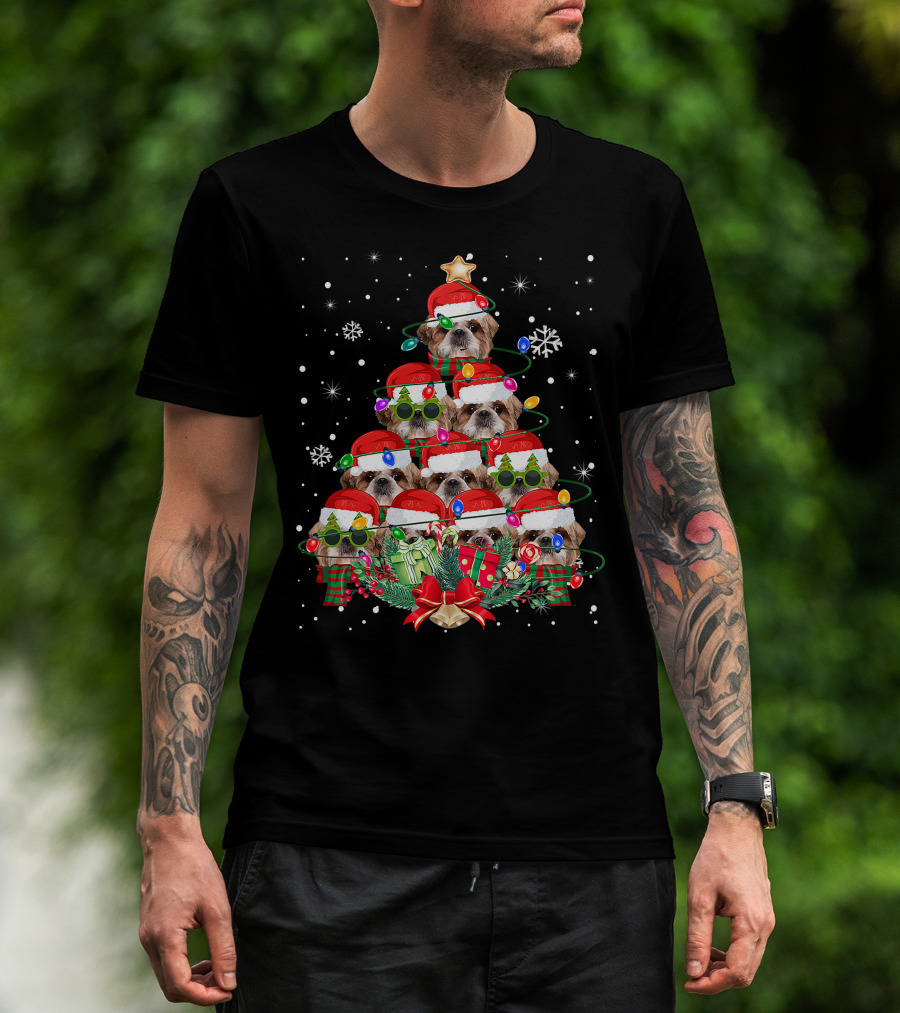 Shih Tzu Christmas Tree With Santa Hats And Lights Family Pajamas T-Shirt