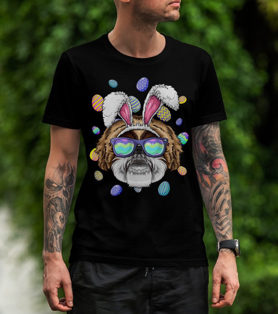 Shih Tzu With Bunny Ears And Sunglasses Surrounded By Colorful Easter Eggs T-Shirt