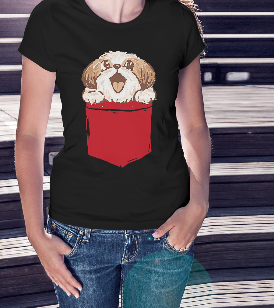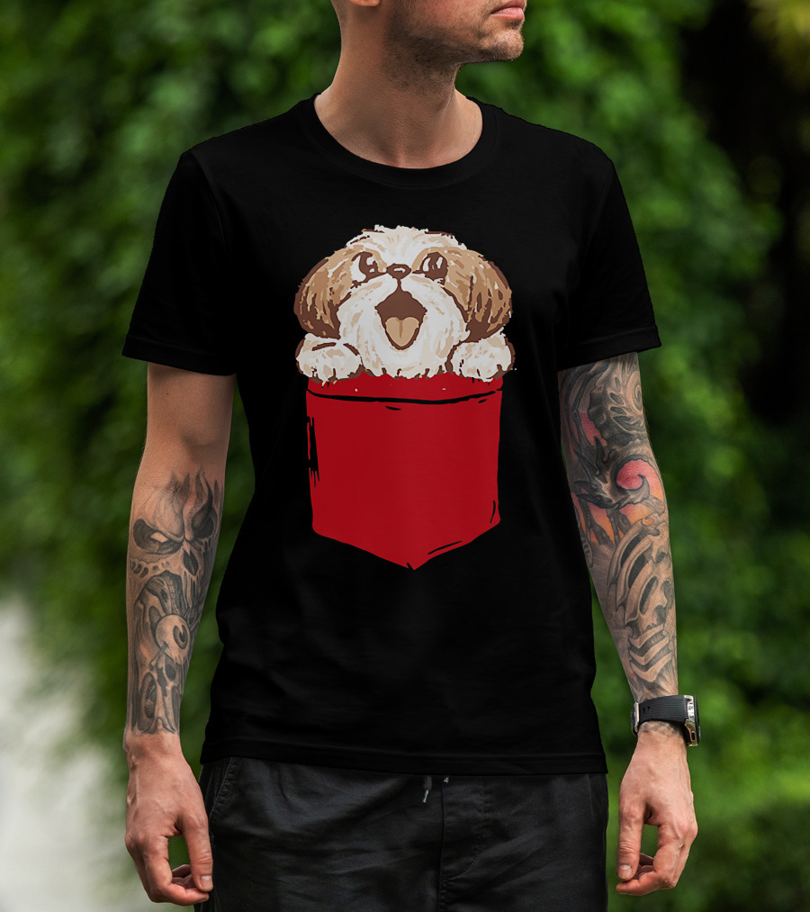 Shih-Tzu Puppy Dog Peeking Out Of Red Pocket T-Shirt