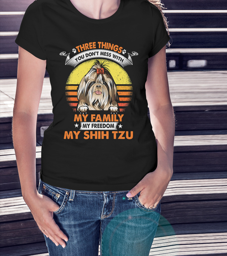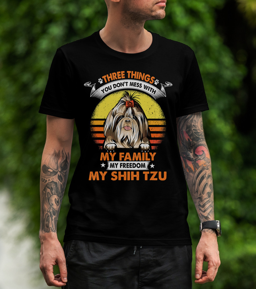 The Three Things My Family My Shih Tzu T-shirt is designed for everyday wear and a consistent fit. Fabric is pre-shrunk ring-spun cotton with durable stitching. See the size chart below for exact measurements.