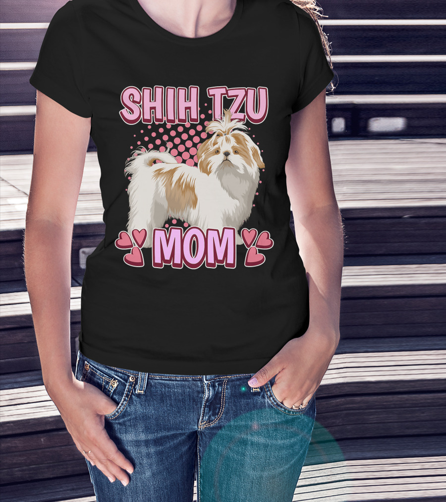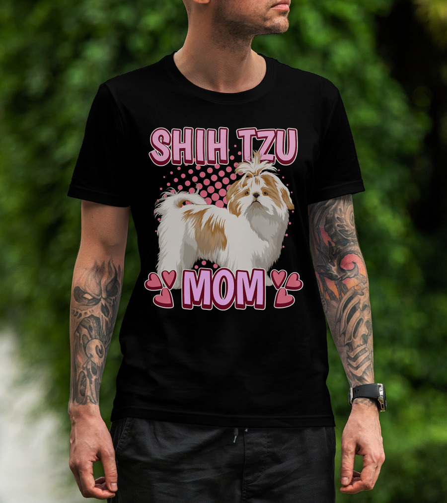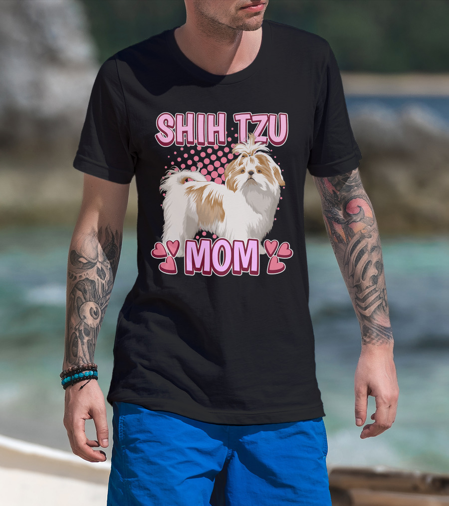 The Shih Tzu Mom With Heart Accents T-shirt is designed for everyday wear and a consistent fit. Fabric is pre-shrunk ring-spun cotton with durable stitching. See the size chart below for exact measurements.