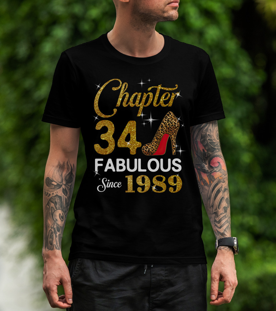The Chapter 34 Fabulous Since 1989 Golden Glitter Leopard Print Heel T-shirt is designed for everyday wear and a consistent fit. Fabric is pre-shrunk ring-spun cotton with durable stitching. See the size chart below for exact measurements.