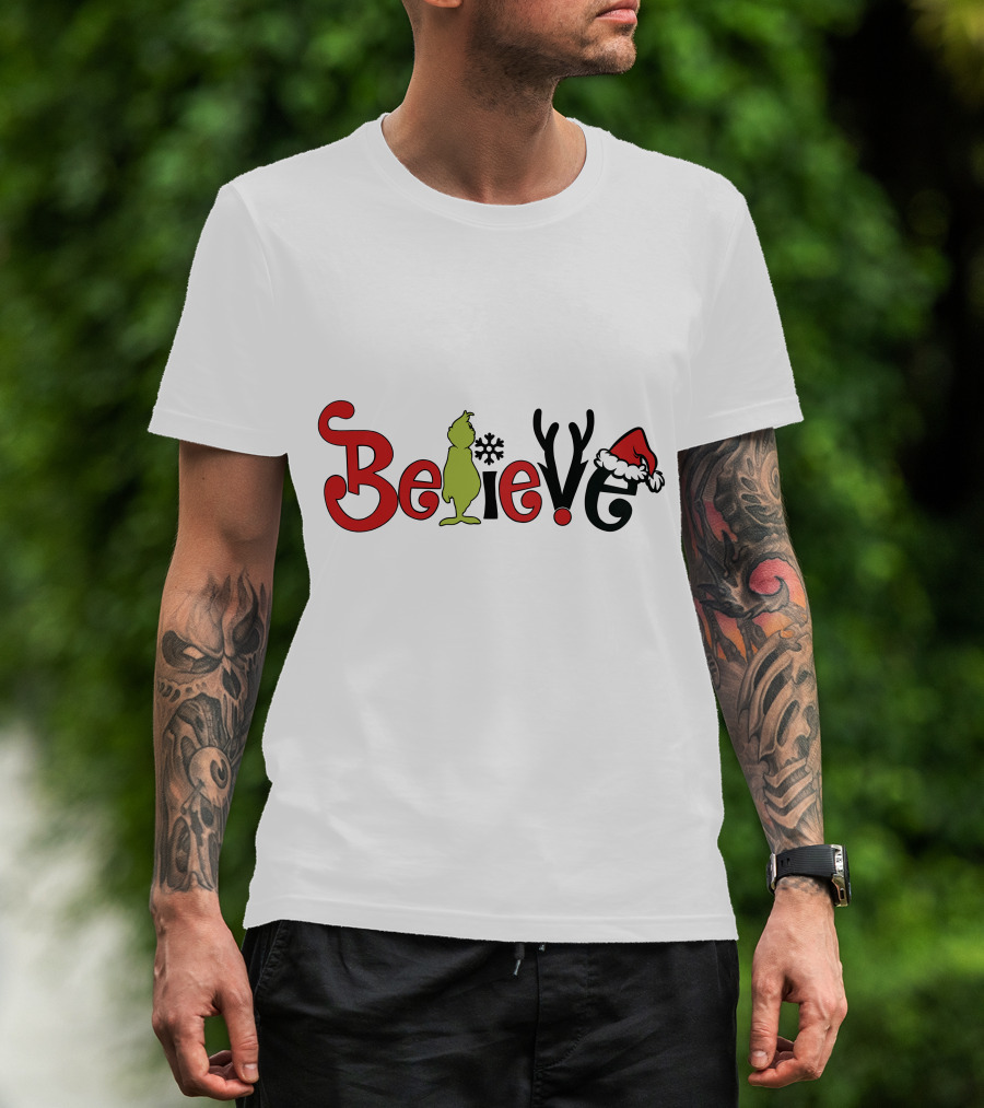 The Grinch Believe Christmas Santa Hat Antlers T-shirt is designed for everyday wear and a consistent fit. Fabric is pre-shrunk ring-spun cotton with durable stitching. See the size chart below for exact measurements.