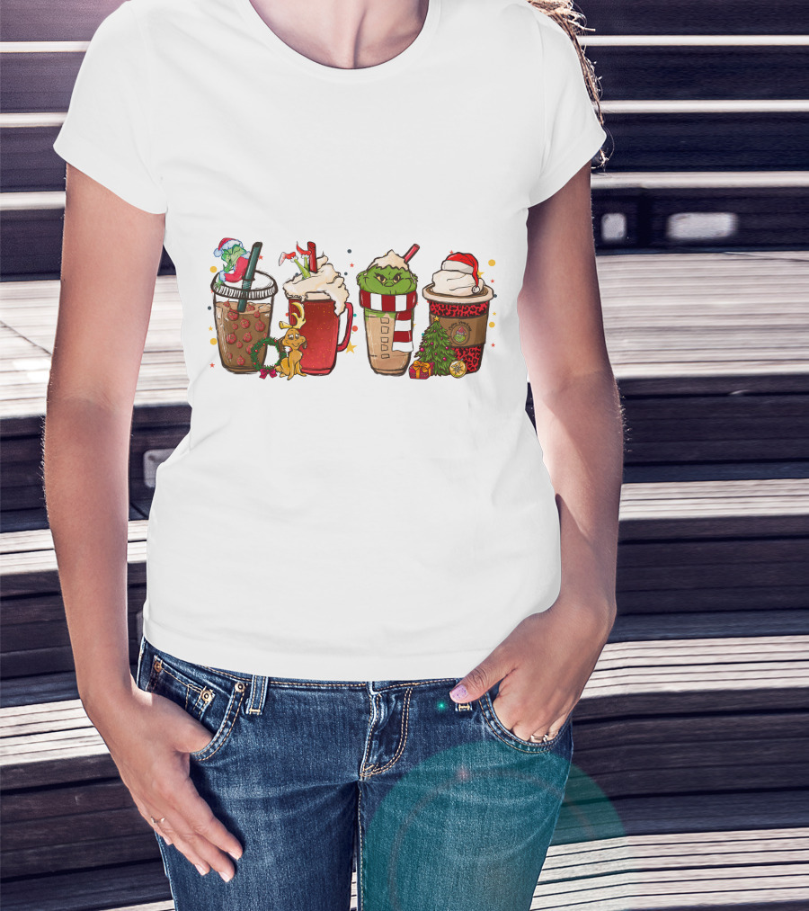 Grinch Christmas Coffee Drinks With Santa Hats And Holiday Decorations T-Shirt