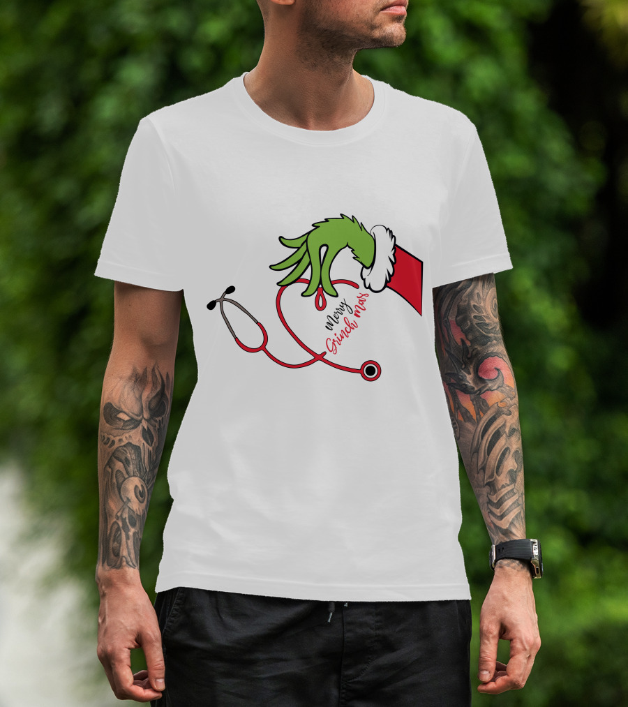Merry Grinchmas Nurse Stethoscope Christmas Grinch Hand T-Shirt