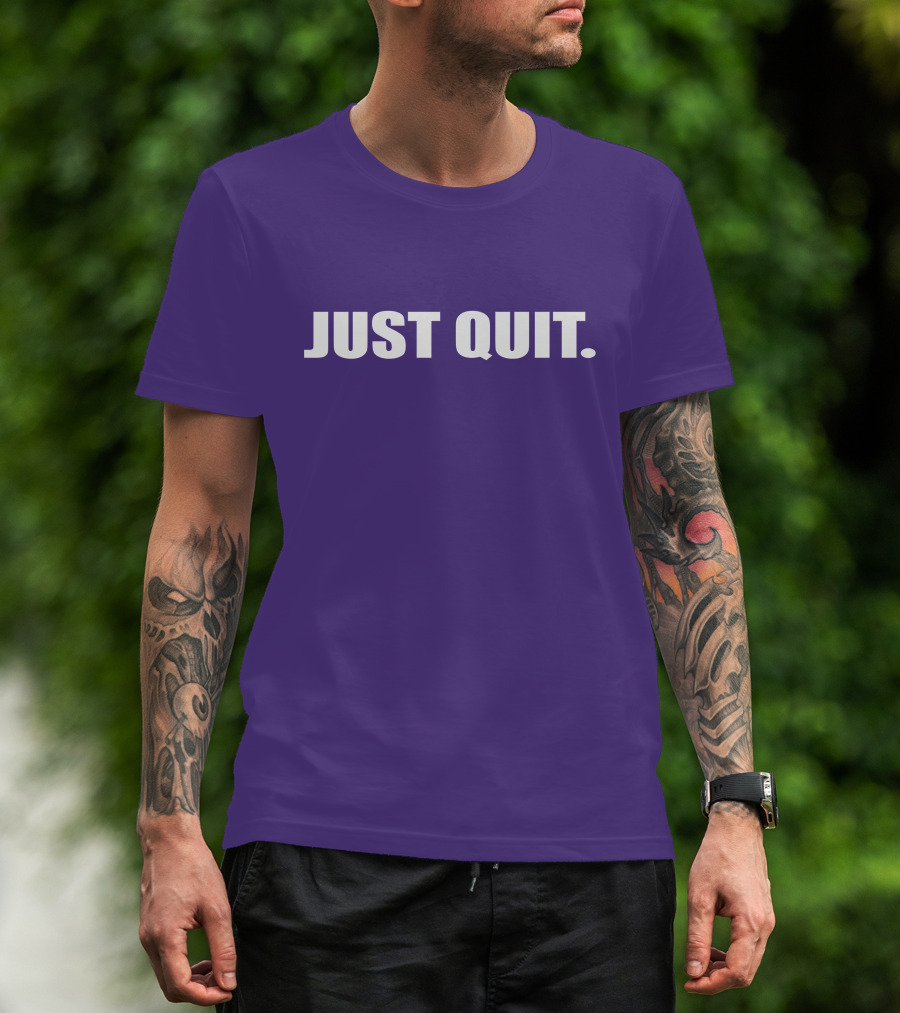 The JUST QUIT T-shirt is designed for everyday wear and a consistent fit. Fabric is pre-shrunk ring-spun cotton with durable stitching. See the size chart below for exact measurements.