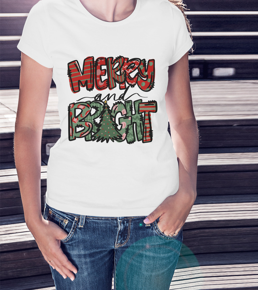 The Merry and Bright Christmas with Tree T-shirt is designed for everyday wear and a consistent fit. Fabric is pre-shrunk ring-spun cotton with durable stitching. See the size chart below for exact measurements.