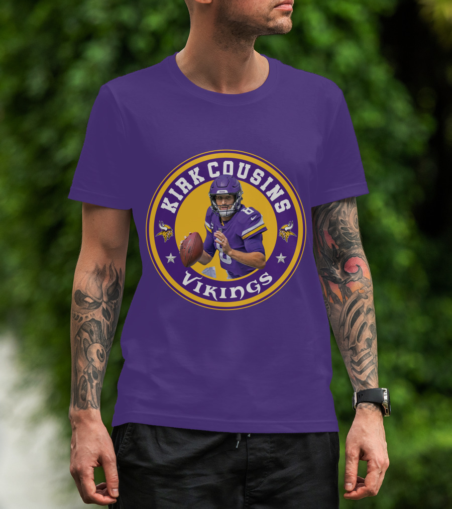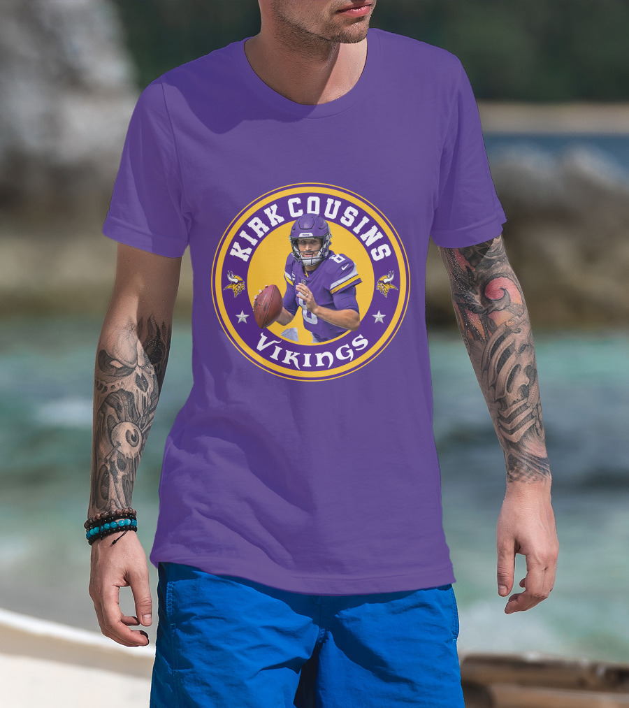 The Kirk Cousins Minnesota Vikings Football Quarterback NFL Logo Circle T-shirt is designed for everyday wear and a consistent fit. Fabric is pre-shrunk ring-spun cotton with durable stitching. See the size chart below for exact measurements.