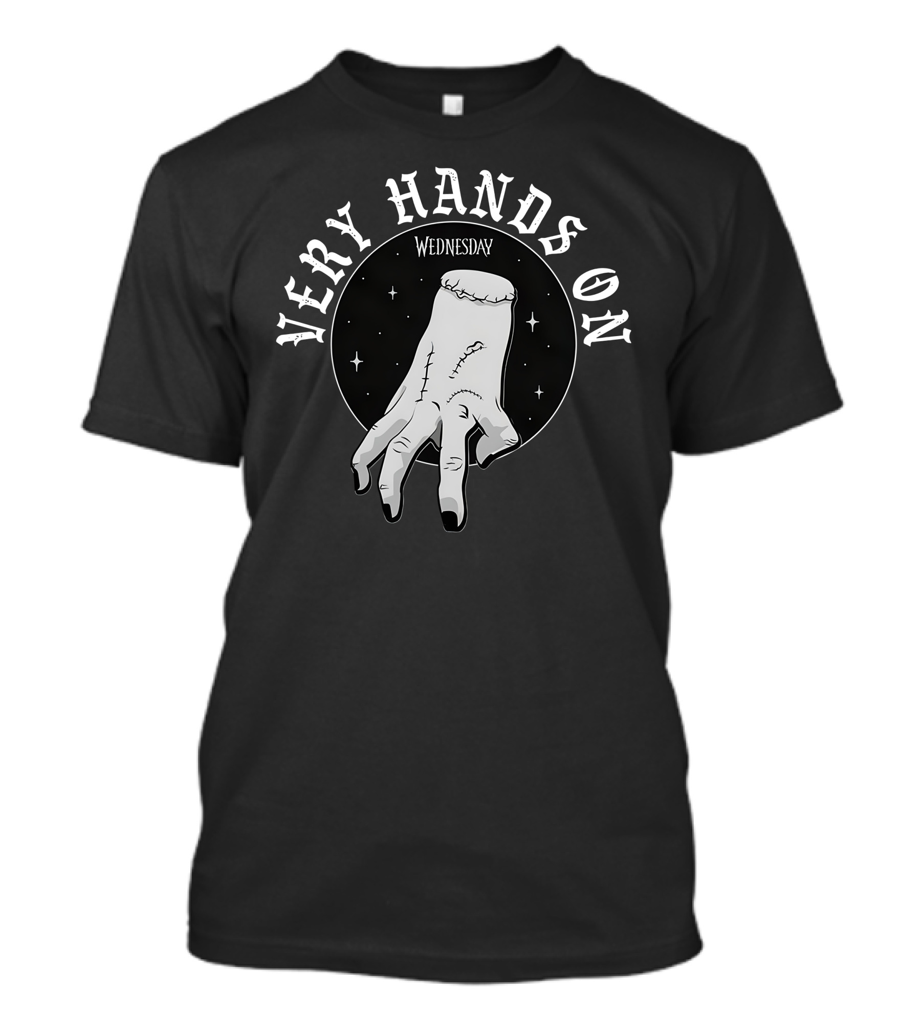The Wednesday Creepy Hand with Stars T-shirt is designed for everyday wear and a consistent fit. Fabric is pre-shrunk ring-spun cotton with durable stitching. See the size chart below for exact measurements.