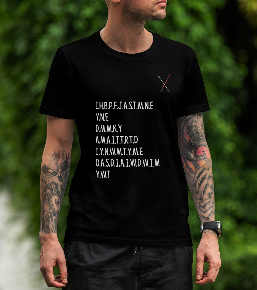 The Prequel Memes I.H.B.P.F.J.A.S.T.M.N.E Y.N.E D.M.M.K.Y A.M.A.I.T.T.R.T.D I.Y.A.N.W.M.T.Y.A.M.E O.A.S.D.I.A.I.W.D.W.I.M Y.W.T Lightsaber References T-shirt is designed for everyday wear and a consistent fit. Fabric is pre-shrunk ring-spun cotton with durable stitching. See the size chart below for exact measurements.