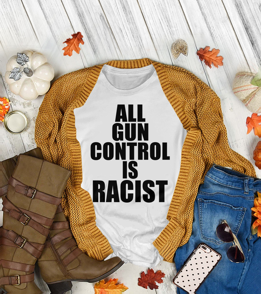 The ALL GUN CONTROL IS RACIST T-shirt is designed for everyday wear and a consistent fit. Fabric is pre-shrunk ring-spun cotton with durable stitching. See the size chart below for exact measurements.