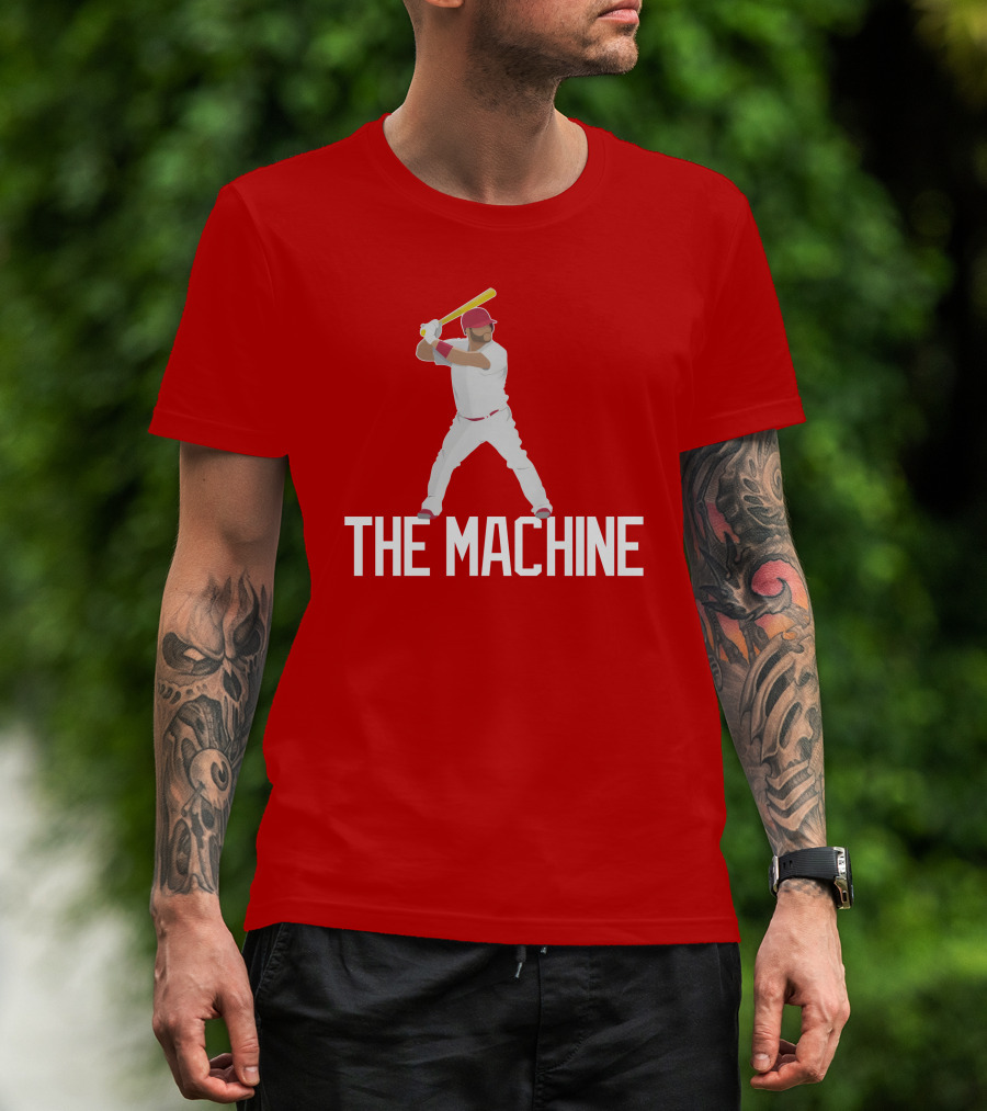 The The Machine Baseball Player in White Uniform with Yellow Bat and Red Cap T-shirt is designed for everyday wear and a consistent fit. Fabric is pre-shrunk ring-spun cotton with durable stitching. See the size chart below for exact measurements.