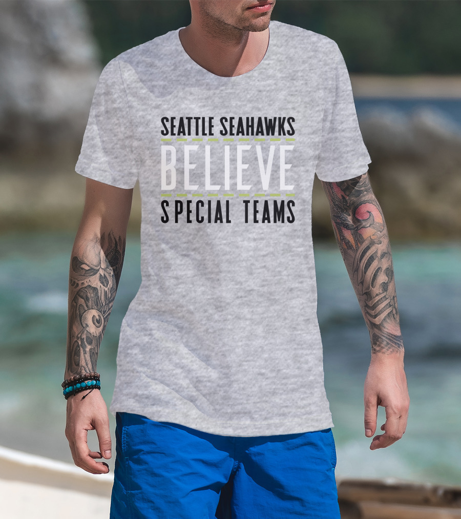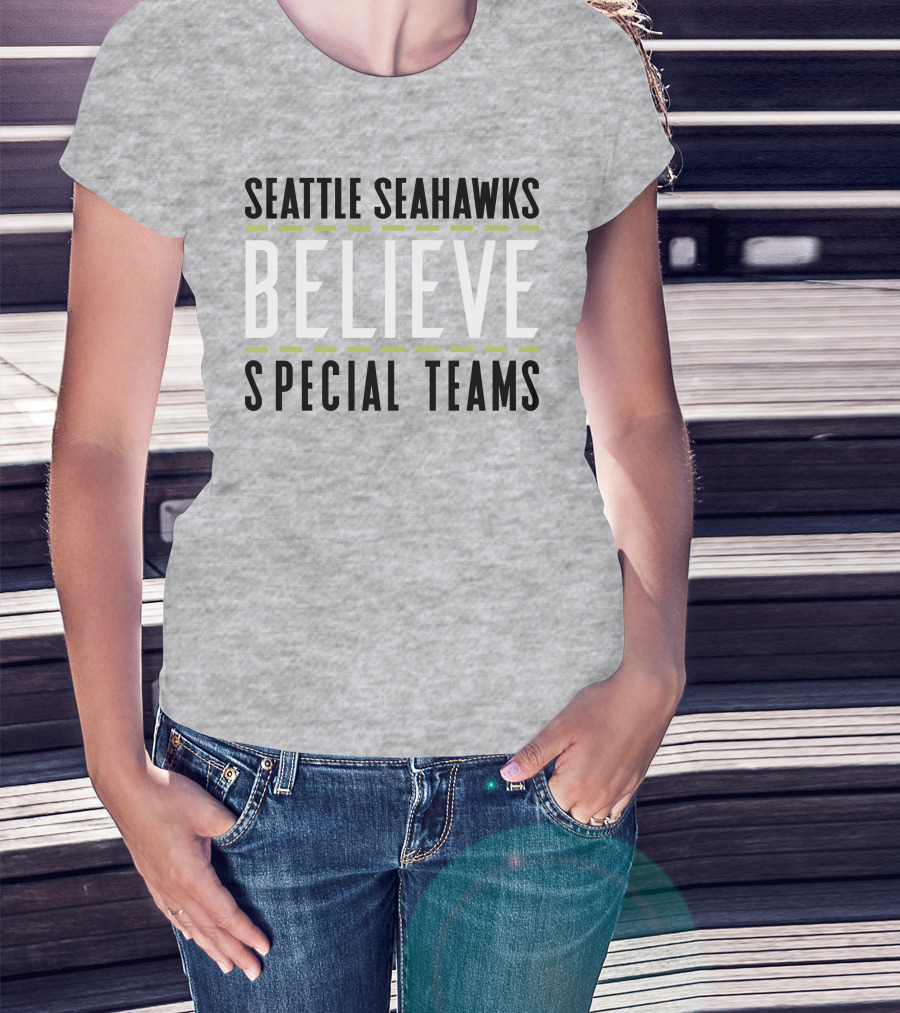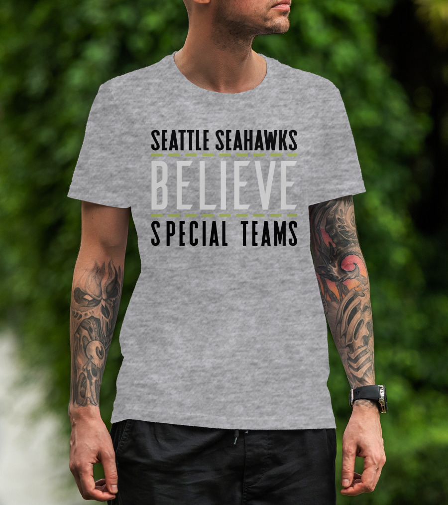 The Seattle Seahawks Believe Special Teams T-shirt is designed for everyday wear and a consistent fit. Fabric is pre-shrunk ring-spun cotton with durable stitching. See the size chart below for exact measurements.