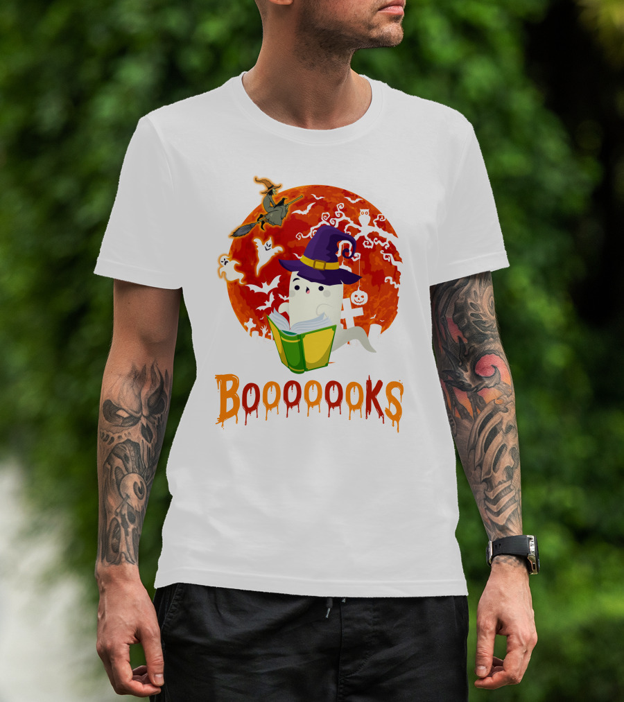 BOOOOOOKS Ghost Reading Witch Hat Halloween Scene T-Shirt