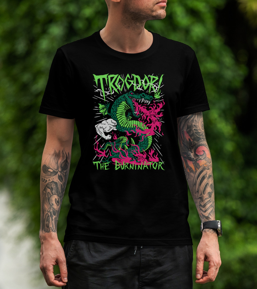 Trogdor The Burninator Green Dragon With Fire And Muscular Arm T-Shirt