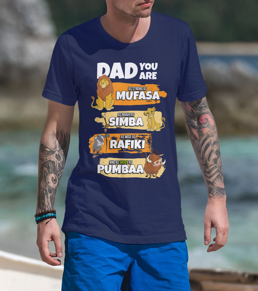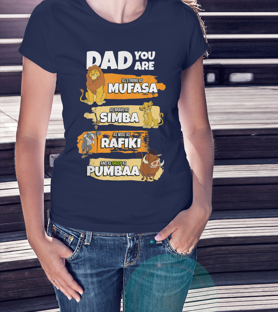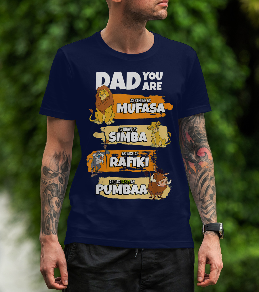 The DAD YOU ARE AS STRONG AS MUFASA AS BRAVE AS SIMBA AS WISE AS RAFIKI AND AS GASSY AS PUMBAA T-shirt is designed for everyday wear and a consistent fit. Fabric is pre-shrunk ring-spun cotton with durable stitching. See the size chart below for exact measurements.