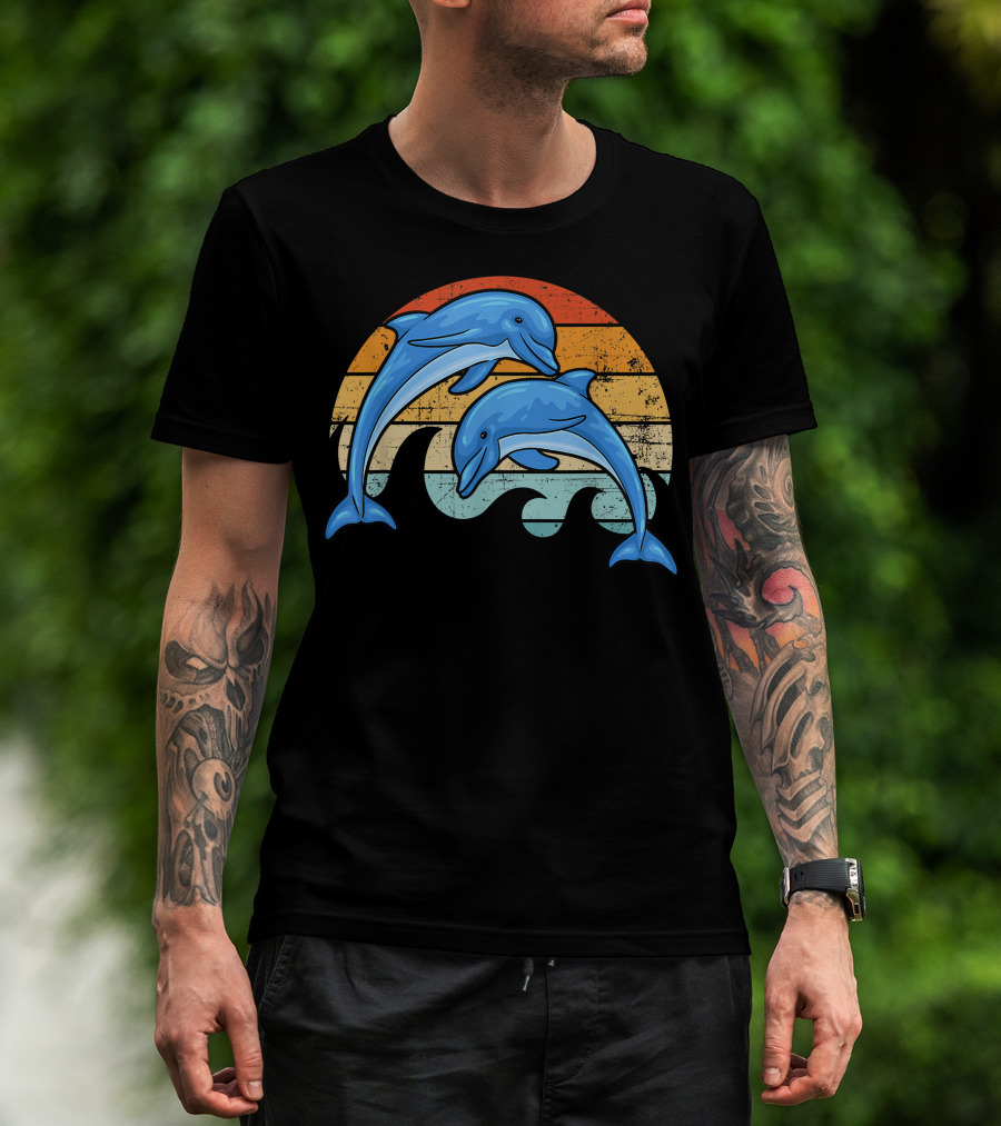 The Vintage Sunset Striped Dolphin Pair T-shirt is designed for everyday wear and a consistent fit. Fabric is pre-shrunk ring-spun cotton with durable stitching. See the size chart below for exact measurements.