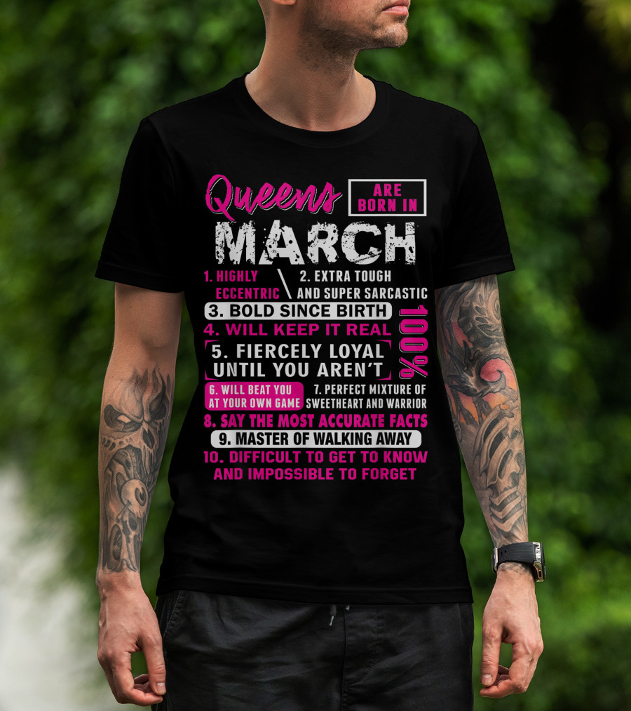 The Queens Are Born in March: Highly Eccentric, Bold Since Birth, Fiercely Loyal, Master of Walking Away, Impossible to Forget T-shirt is designed for everyday wear and a consistent fit. Fabric is pre-shrunk ring-spun cotton with durable stitching. See the size chart below for exact measurements.